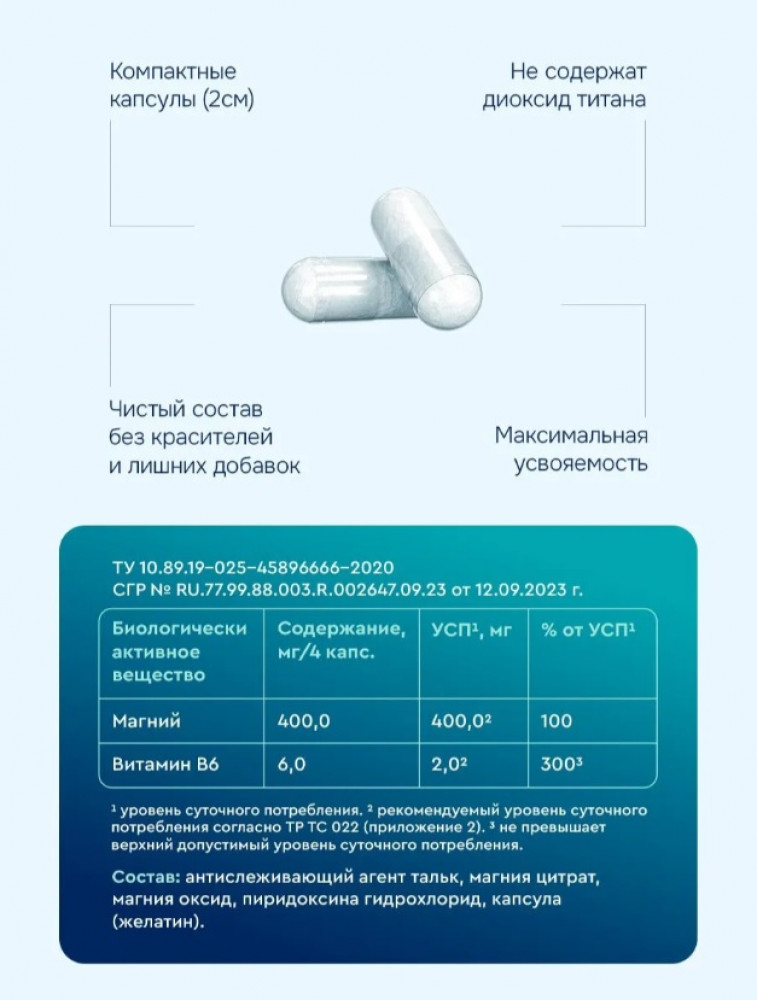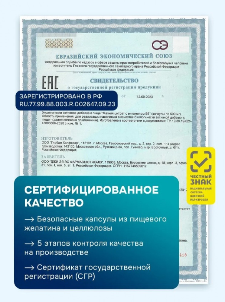 💳 Оплатить за товар можно при получении 🇰🇿 Есть бесплатная доставка по Казахстану от 1 дня 🎁 Копите бонусы с каждой покупки Магний цитрат с витамином B6 – органическая форма, обладающая высокой биодоступностью (лучше усваивается). Магний В6 является важнейшим элементом организма взрослых в борьбе со повседневным стрессом. Витамины с магнием обладают мягким успокаивающим (седативным) действием. Положительно влияют на эмоциональное состояние, позволяют легче справляться со стрессом, тревогой, беспокойством. |