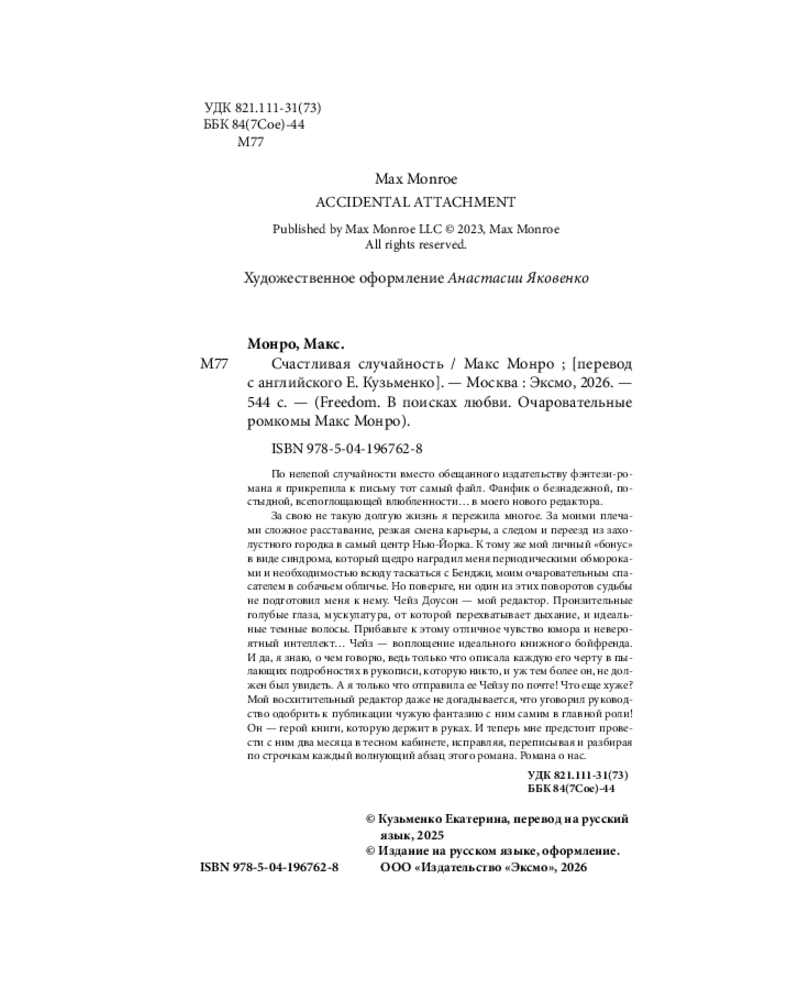 💳 Оплатить за товар можно при получении 🇰🇿 Есть бесплатная доставка по Казахстану от 1 дня 🎁 Копите бонусы с каждой покупки Серия: Freedom. В поисках любви. Очаровательные ромкомы Макс Монро За свою не такую долгую жизнь я пережила многое. За моими плечами сложное расставание, резкая смена карьеры, а следом и переезд из захолустного городка в самый центр Нью-Йорка. К тому же мой личный «бонус» в виде синдрома, который щедро наградил меня периодическими обмороками и необходимостью всюду таскаться с Бенджи, моим очаровательным спасателем в собачьем обличье. Но поверьте, ни один из этих поворотов судьбы не подготовил меня к нему. Чейз Доусон — мой редактор. Пронзительные голубые глаза, мускулатура, от которой перехватывает дыхание, и идеальные темные волосы. Прибавьте к этому отличное чувство юмора и невероятный интеллект... |