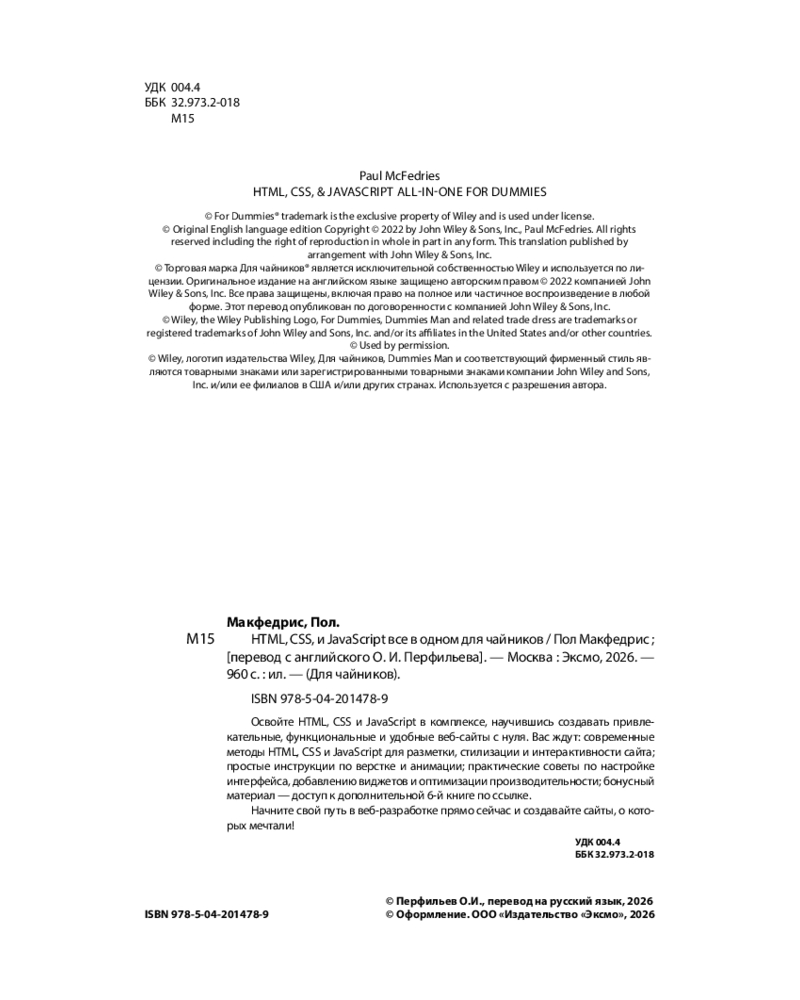 💳 Оплатить за товар можно при получении 🇰🇿 Есть бесплатная доставка по Казахстану от 1 дня 🎁 Копите бонусы с каждой покупки Серия: Для чайников Хотите научиться создавать привлекательные, функциональные веб-сайты, но боитесь сложности? Эта книга специально создана для тех, кто хочет овладеть веб-разработкой с нуля, без необходимости покупать несколько разных учебников. Здесь собрано всё самое важное: от основ до практических навыков создания реальных проектов. Пять книг в одной обложке — это полный путь веб-разработчика. Вы начнете с введения в веб-интерфейсы, затем освоите язык разметки HTML для создания структуры страниц, изучите CSS для стилизации и дизайна, научитесь добавлять интерактивность с помощью JavaScript и узнаете, как создавать оптимальные макеты, которые одинаково хорошо выглядят на любых устройствах. |
