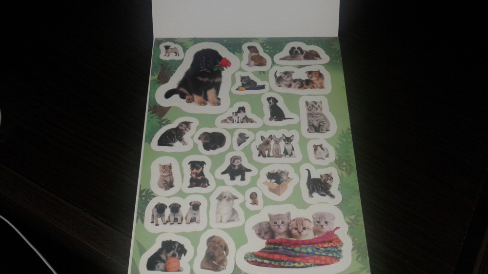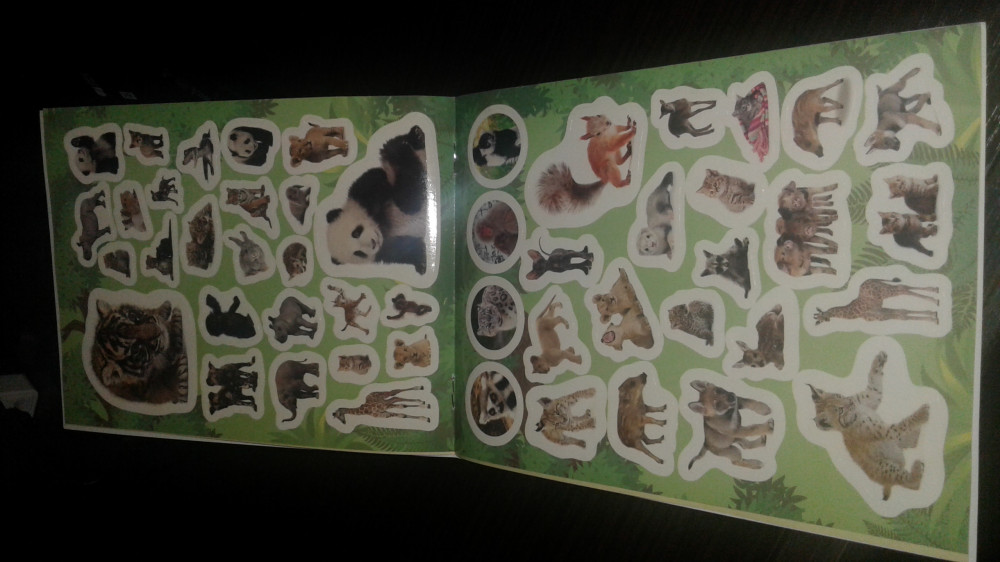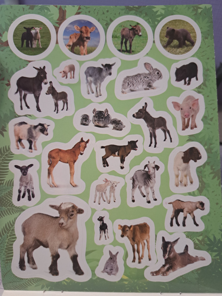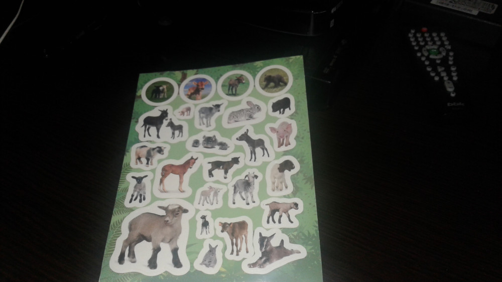 Внутри обложки находится лист формата А4 сложенный в два раза. Можно оторвать от обложки и развернуть для удобства. Наклейки хорошего качества, принт четкий и достаточно яркий. Много мелких наклеек и повторяющихся животных (козликов, например, в различных положениях и ракурсах).
