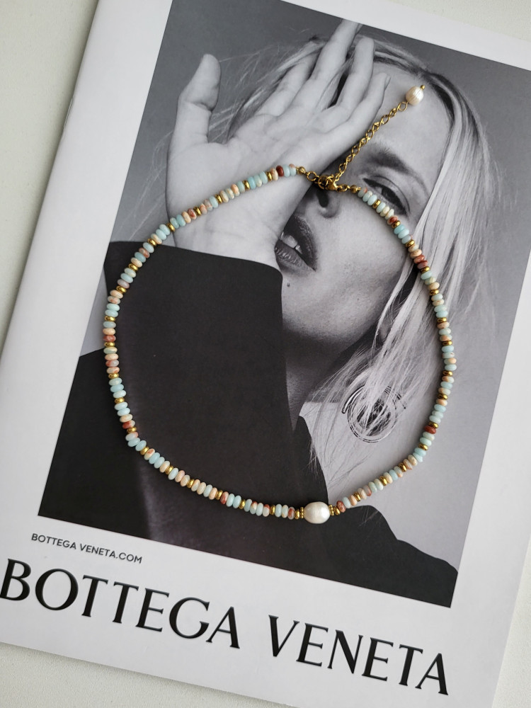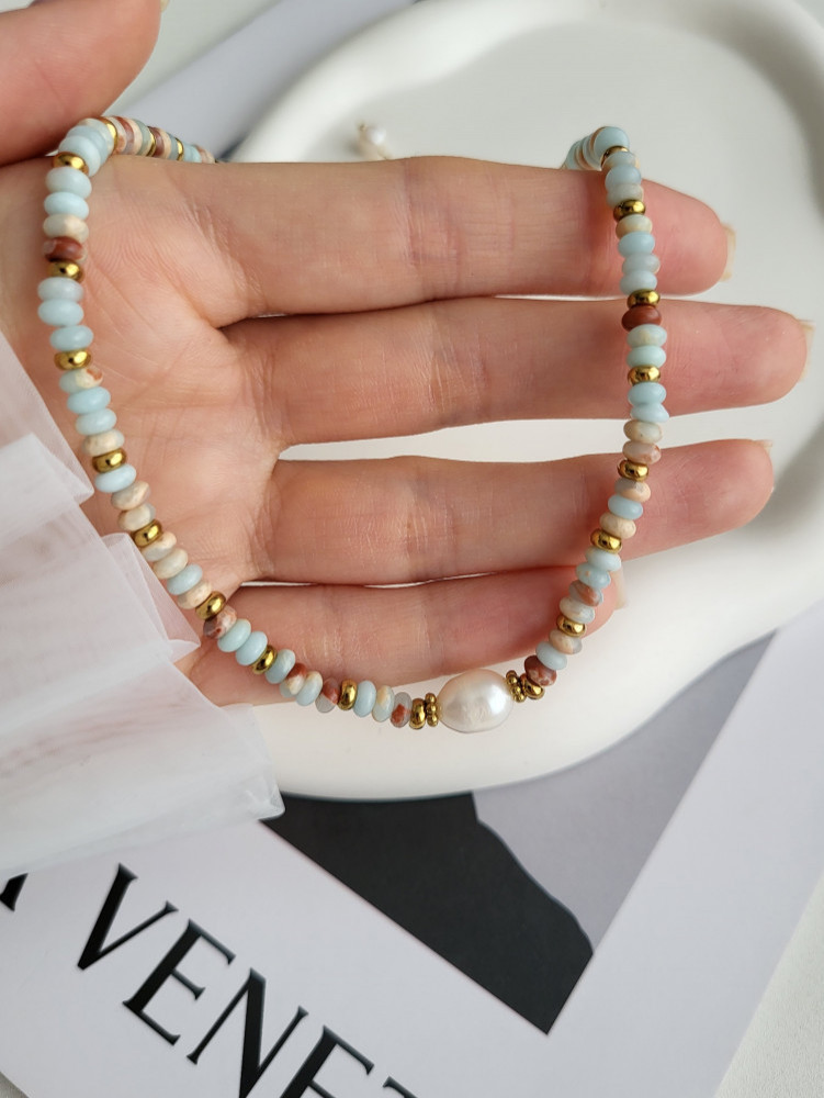 Чокер из ювелирной стали с натуральным камнем и жемчугом
