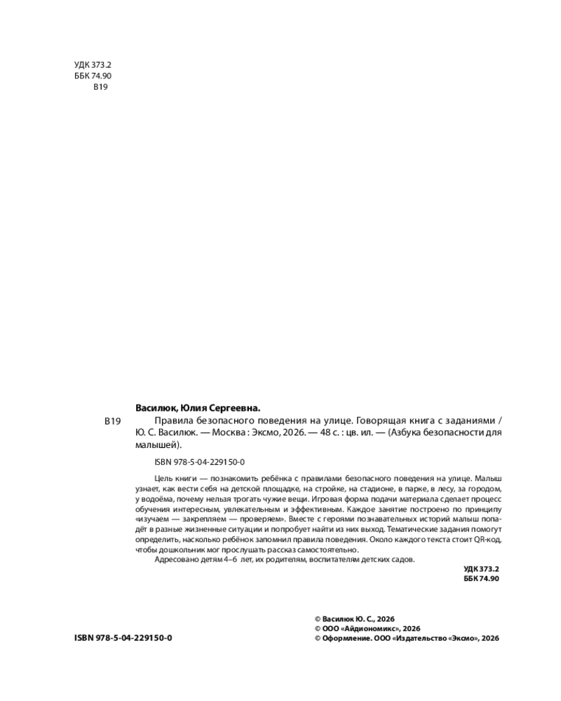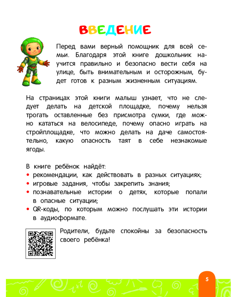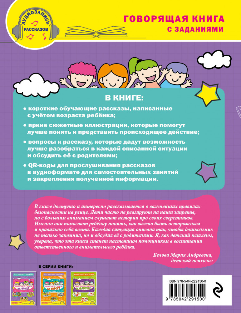 💳 Оплатить за товар можно при получении 🇰🇿 Есть бесплатная доставка по Казахстану от 1 дня 🎁 Копите бонусы с каждой покупки Серия: Азбука безопасности для малышей Научить детей правилам поведения и основам безопасности — важная задача для любого родителя. Книга от издательства «Эксмо», сделанная в формате развивашки, станет незаменимым помощником для мальчиков и девочек, превращая обучение в увлекательное приключение. В ней простым и доступным языком рассказываются истории, которые помогают детям понять, как правильно вести себя на улице. В пособии разбираются темы: на детской площадке, на стройке, на стадионе, в парке, в лесу, за городом, у водоема, подозрительные предметы и др. Вместо скучных запретов ребенку предлагаются интересные истории, которые легко запоминаются и обсуждаются в кругу семьи. Около каждого рассказа имеется QR-код, чтобы ребенок смог прослушать текст самостоятельно. Развивающее пособие для детей 4-6 лет станет отличным подарком любому ребенку к Новому году, дню рождения и другим праздникам, а также верным помощником для родителей, которые хотят вырастить воспитанных и уверенных в себе детей. Если ребенка заинтересует такой способ обучения, рекомендуем обратить внимание на другие книги серии: «Правила безопасного поведения в квартире. Говорящая книга с заданиями», "Правила безопасности на дороге. Говорящая книга с заданиями». |