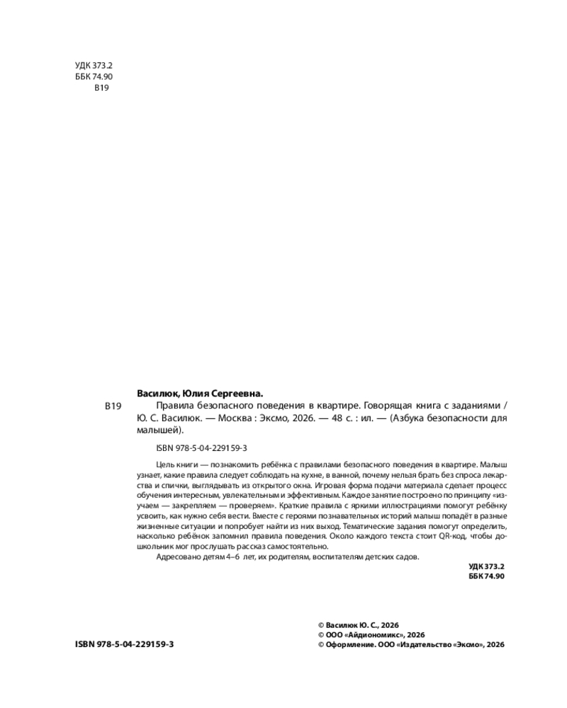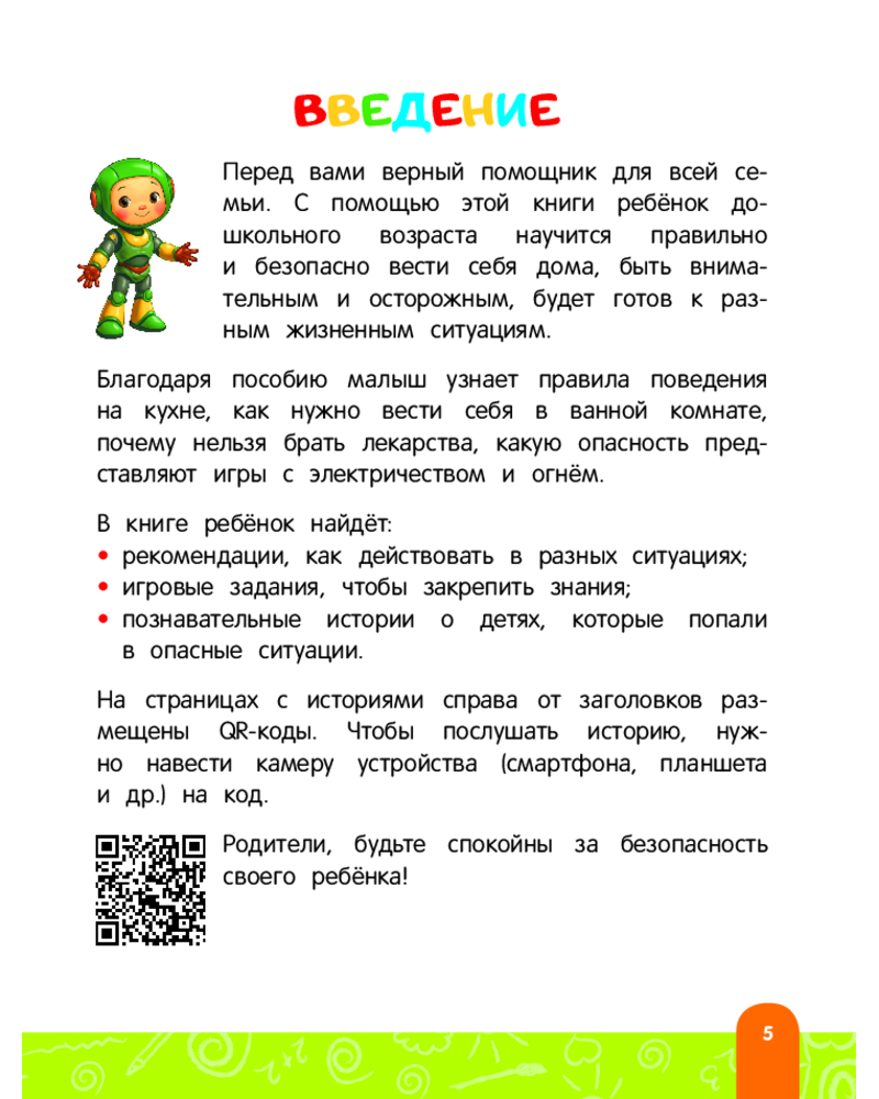 💳 Оплатить за товар можно при получении 🇰🇿 Есть бесплатная доставка по Казахстану от 1 дня 🎁 Копите бонусы с каждой покупки Серия: Азбука безопасности для малышей Научить детей правилам поведения и основам безопасности — важная задача для любого родителя. Книга от издательства «Эксмо», сделанная в формате развивашки, станет незаменимым помощником для мальчиков и девочек, превращая обучение в увлекательное приключение. В ней простым и доступным языком рассказываются истории, которые помогают детям понять, как правильно себя вести в квартире. В пособии разбираются темы: на кухне, в ванной комнате, электричество, лекарства, открытое окно, опасные предметы. Вместо скучных запретов ребенку предлагаются интересные истории, которые легко запоминаются и обсуждаются в кругу семьи. Около каждого рассказа имеется QR-код, чтобы ребенок смог прослушать текст самостоятельно. Развивающее пособие для детей 4-7 лет станет отличным подарком любому ребенку к Новому году, дню рождения и другим праздникам, а также верным помощником для родителей, которые хотят вырастить воспитанных и уверенных в себе детей. Если ребенка заинтересует такой способ обучения, рекомендуем обратить внимание на другие книги серии: «Правила безопасного поведения на улице. Говорящая книга с заданиями», «Правила безопасности на дороге. Говорящая книга с заданиями». |