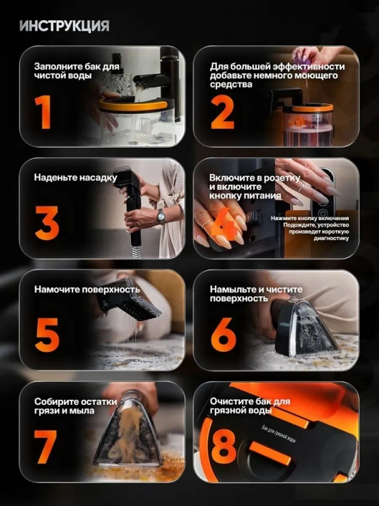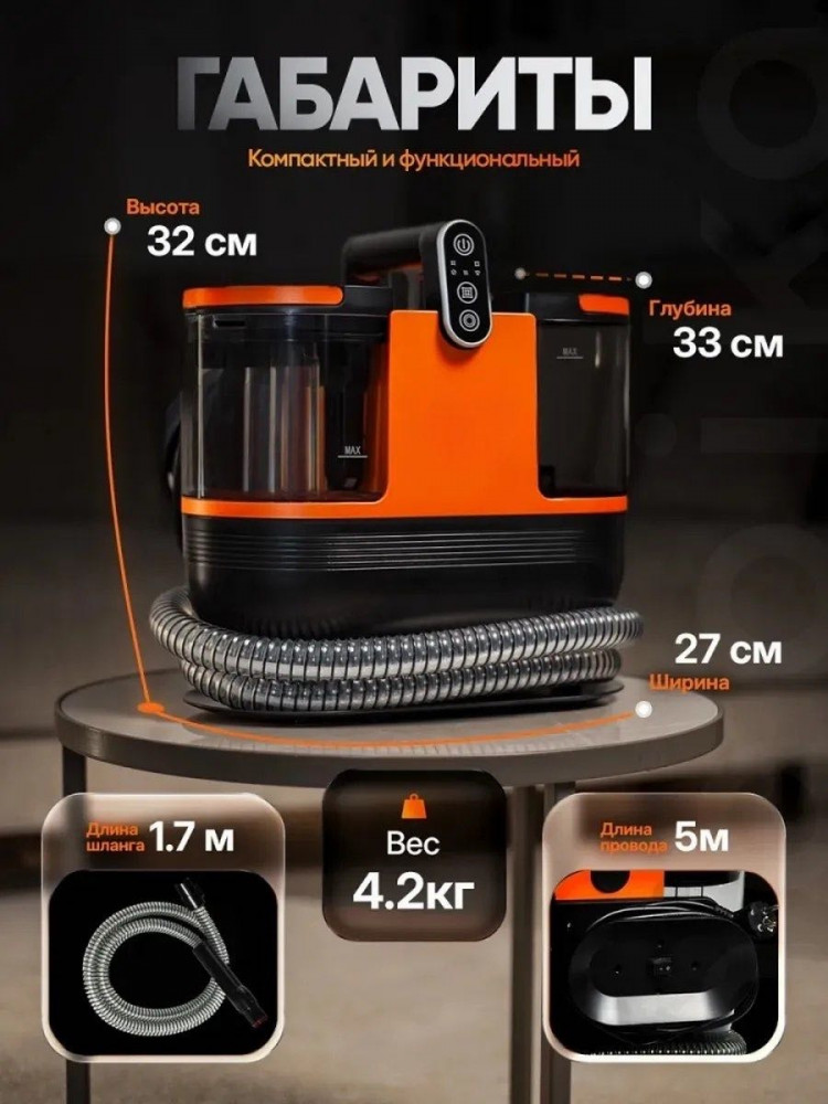 💳 Оплатить за товар можно при получении 🇰🇿 Есть бесплатная доставка по Казахстану от 1 дня 🎁 Копите бонусы с каждой покупки Моющий пылесос для химчистки мебели и ковров — практичное и эффективное решение для поддержания чистоты в доме. Устройство сочетает функции сухой и влажной уборки, обеспечивая качественную очистку мягкой мебели, ковров, матрасов, полов и текстильных поверхностей. Пылесос помогает удалять пыль, загрязнения, шерсть домашних животных и другие мелкие частицы, способствуя более чистой и комфортной домашней среде. Удобный контейнер для сбора пыли и грязи облегчает уход за прибором и позволяет быстро очистить его после использования. |