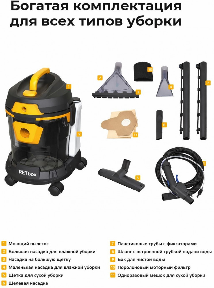 💳 Оплатить за товар можно при получении 🇰🇿 Есть бесплатная доставка по Казахстану от 1 дня 🎁 Копите бонусы с каждой покупки Универсальный моющий пылесос RETbox RB-001 поможет с легкостью провести сухую и влажную уборку дома, экономя средства на химчистке мебели. Мощность пылесоса составляет 1400 Вт, что обеспечивает высокую производительность и мощность всасывания 300 Вт. Это позволяет эффективно удалять пыль и грязь с различных поверхностей, включая полы, ковры и мебель. |