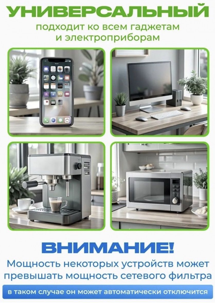 💳 Оплатить за товар можно при получении 🇰🇿 Есть бесплатная доставка по Казахстану от 1 дня 🎁 Копите бонусы с каждой покупки Сетевой фильтр с беспроводной зарядкой 2500W, 6 розеток, 4 USB, 2 Type-C, 3 м. Сетевой фильтр с USB и Type-C — это удобное и безопасное решение для одновременного подключения и зарядки до 9 устройств. Подходит для дома, офиса, рабочего стола, учебы и путешествий. |