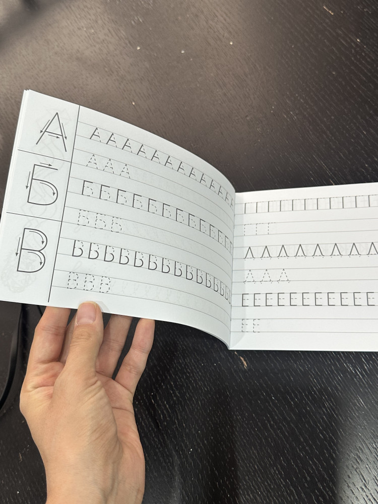 Пропись небольшого формата, в линейку, после грибочков, крючков и палочек начинаются буквы, на страничке три буквы, каждая по две строчки и на полях стрелочками дана техника написания каждой буквы, качество бумаги хорошее, нам очень понравилась.