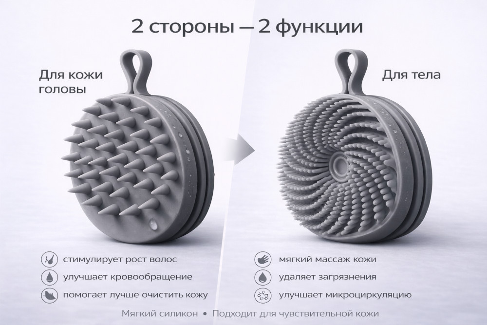 💳 Оплатить за товар можно при получении 🇰🇿 Есть бесплатная доставка по Казахстану от 1 дня 🎁 Копите бонусы с каждой покупки Массажная силиконовая мочалка 2-в-1 — удобный аксессуар для ежедневного ухода за телом и кожей головы. |