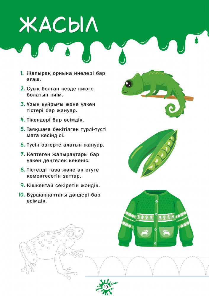 💳 Оплатить за товар можно при получении 🇰🇿 Есть бесплатная доставка по Казахстану от 1 дня 🎁 Копите бонусы с каждой покупки Бұл оқу құралы баланы түрлі-түсті суреттер, ойын тапсырмалары және танымал «Көрсет те, ата» ойыны арқылы түстердің қызықты әлемімен таныстырады. Құралдың ашылған екі бетінде түстері бірдей үлкен суреттер және сабақтарды тек қызықты ғана емес, сонымен бірге танымдық қабілеттерді дамытуға арналған сұрақтар берілген. Қосымша тапсырмалар – бояу және айналдырып сызу – ұсақ моториканы, зейінді және көру қабілетін дамытуға көмектеседі. Басылымның соңында өткен материалды қайталауға және бекітуге арналған беттер орналасқан. |