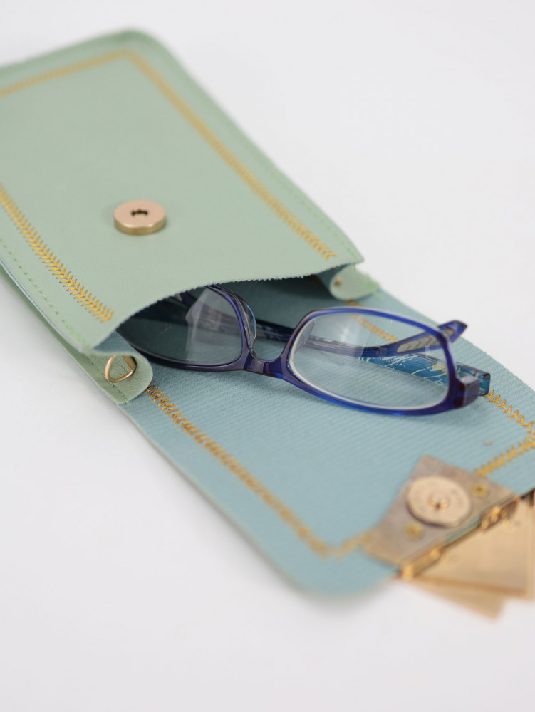 Модель выполнена из качественной экокожи нежного мятного цвета. Материал приятный на ощупь, хорошо держит форму и устойчив к ежедневному использованию. Декоративная золотистая прострочка и стильная металлическая фурнитура придают аксессуару элегантный и современный вид.