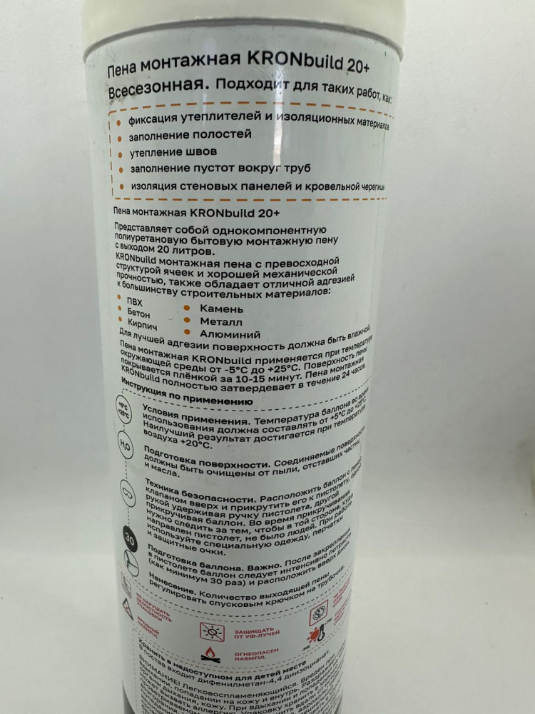 💳 Оплатить за товар можно при получении 🇰🇿 Есть бесплатная доставка по Казахстану от 1 дня 🎁 Копите бонусы с каждой покупки Бытовая всесезонная монтажная пена KRONbuild 40+ применяется при температуре —5° до +30° С. Поверхность пены покрывается пленкой за 15–30 минут. Пена монтажная KRONbuild полностью затвердевает в течение 24 часов. |