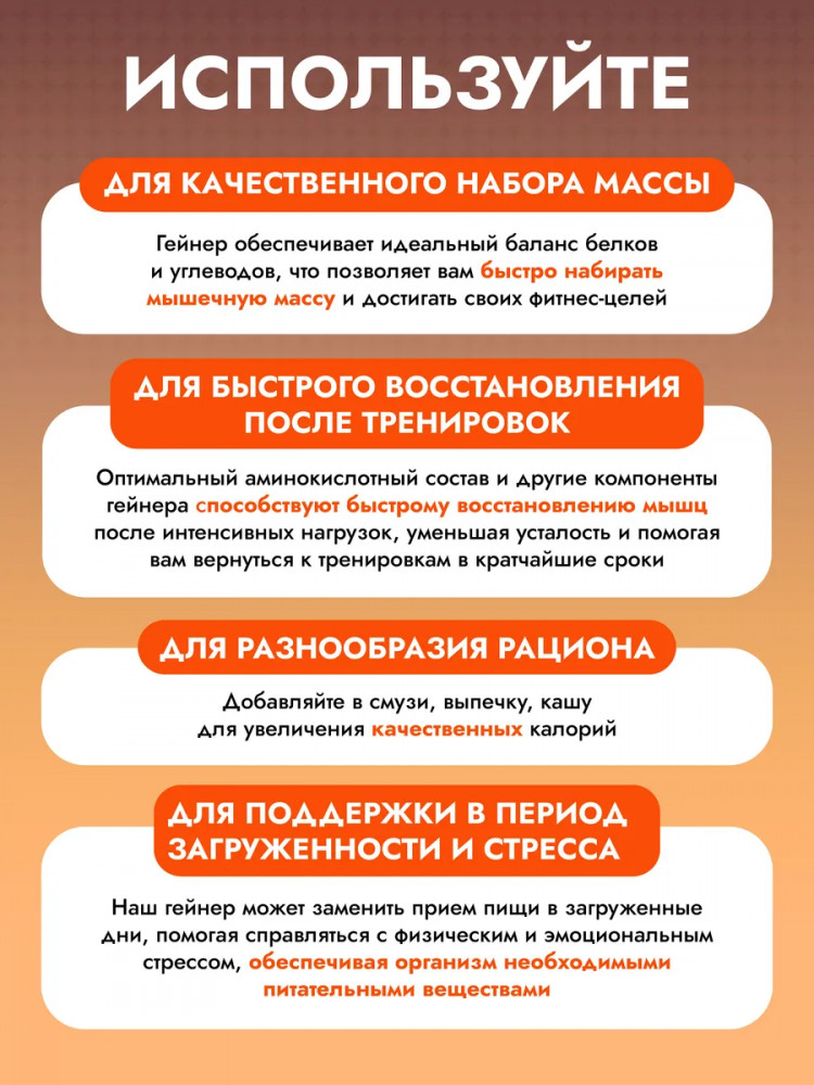Cybermass Gainer Mass Hi-protein — спортивное питание нового поколения для набора мышечной массы. Это высокоэффективный гейнер на простых и сложных углеводах, разработанный специально для мужчин и женщин, стремящихся к быстрому и качественному набору массы, росту мышц и увеличению силы. Формула протеинового коктейля сбалансирована таким образом, чтобы обеспечить организм всем необходимым — белками, углеводами, витаминами, минералами и аминокислотами без лишнего сахара, глютена, ГМО и сои. Это отличный выбор как для новичков в спортпите, так и для опытных спортсменов, желающих выйти на новый уровень.