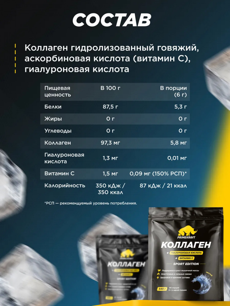 Гидролизованный говяжий коллаген от Primekraft — это специализированная добавка для укрепления и восстановления суставов и связок. Препарат содержит чистый коллаген 1 и 3 типа, обогащен витамином С и гиалуроновой кислотой для максимального усвоения и поддержки опорно-двигательного аппарата атлетов. Primekraft представляет гидролизованный коллаген «Sport Edition» — формулу, созданную для активного восстановления и укрепления соединительных тканей. Эта добавка необходима спортсменам для поддержания здоровья суставов, связок и костей при интенсивных нагрузках.
