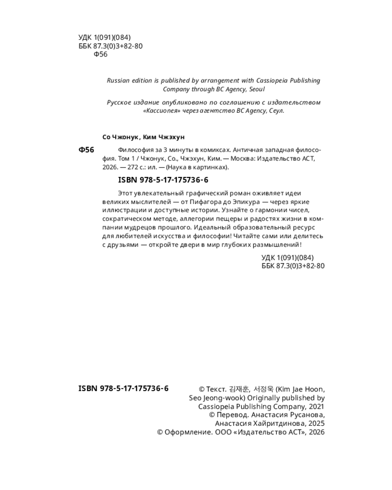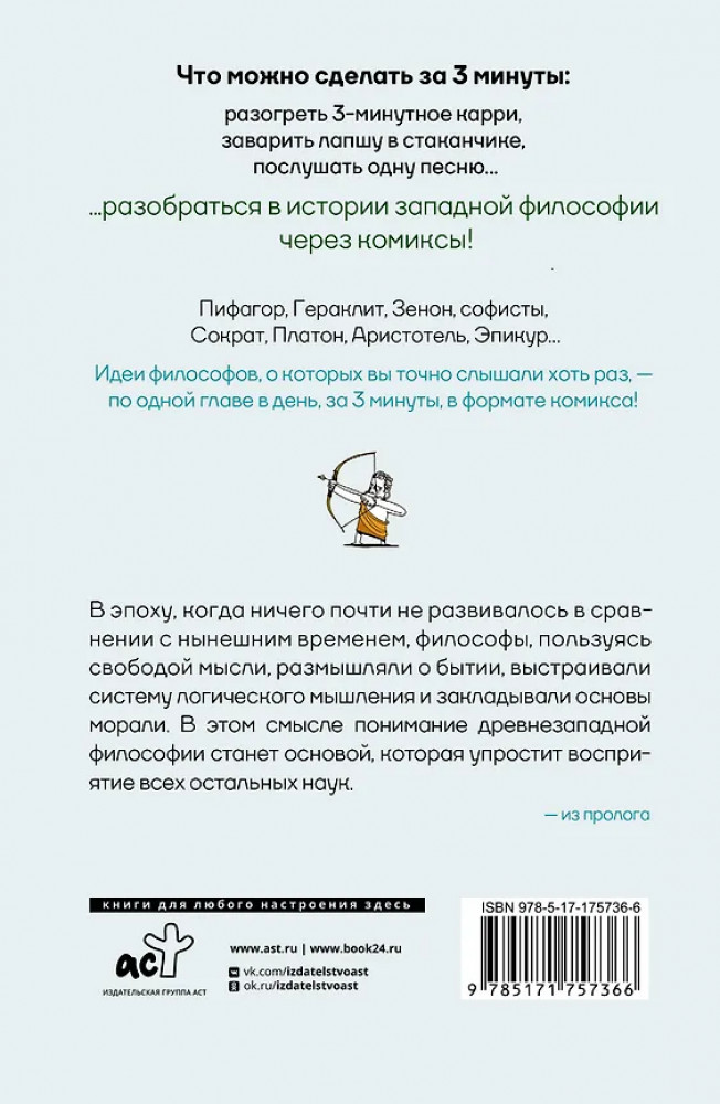 💳 Оплатить за товар можно при получении 🇰🇿 Есть бесплатная доставка по Казахстану от 1 дня 🎁 Копите бонусы с каждой покупки Серия: Наука в картинках Этот увлекательный графический роман оживляет идеи великих мыслителей — от Пифагора до Эпикура — через яркие иллюстрации и доступные истории. Узнайте о гармонии чисел, сократическом методе, аллегории пещеры и радостях жизни в компании мудрецов прошлого. Идеальный образовательный ресурс для любителей искусства и философии! Читайте сами или делитесь с друзьями — откройте двери в мир глубоких размышлений! |