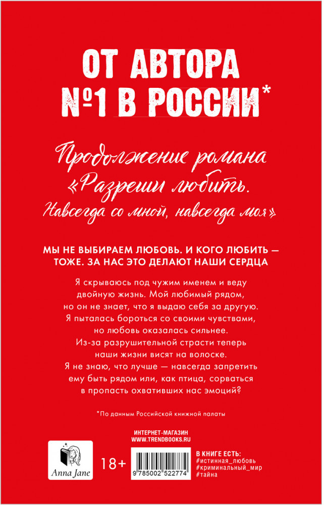 💳 Оплатить за товар можно при получении 🇰🇿 Есть бесплатная доставка по Казахстану от 1 дня 🎁 Копите бонусы с каждой покупки Долгожданное продолжение бестселлера «Разреши любить. Навсегда со мной, навсегда моя» Анны Джейн. Истинная любовь и огненная страсть, непредсказуемые сюжетные повороты и страшные тайны прошлого в романе королевы Young Adult «Разреши любить. Позволь мне быть рядом». История, которая срывает маски и ставит перед выбором, который изменит жизнь. |