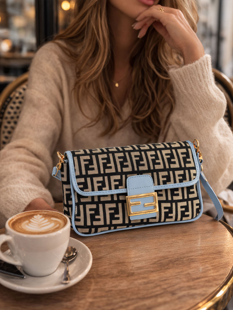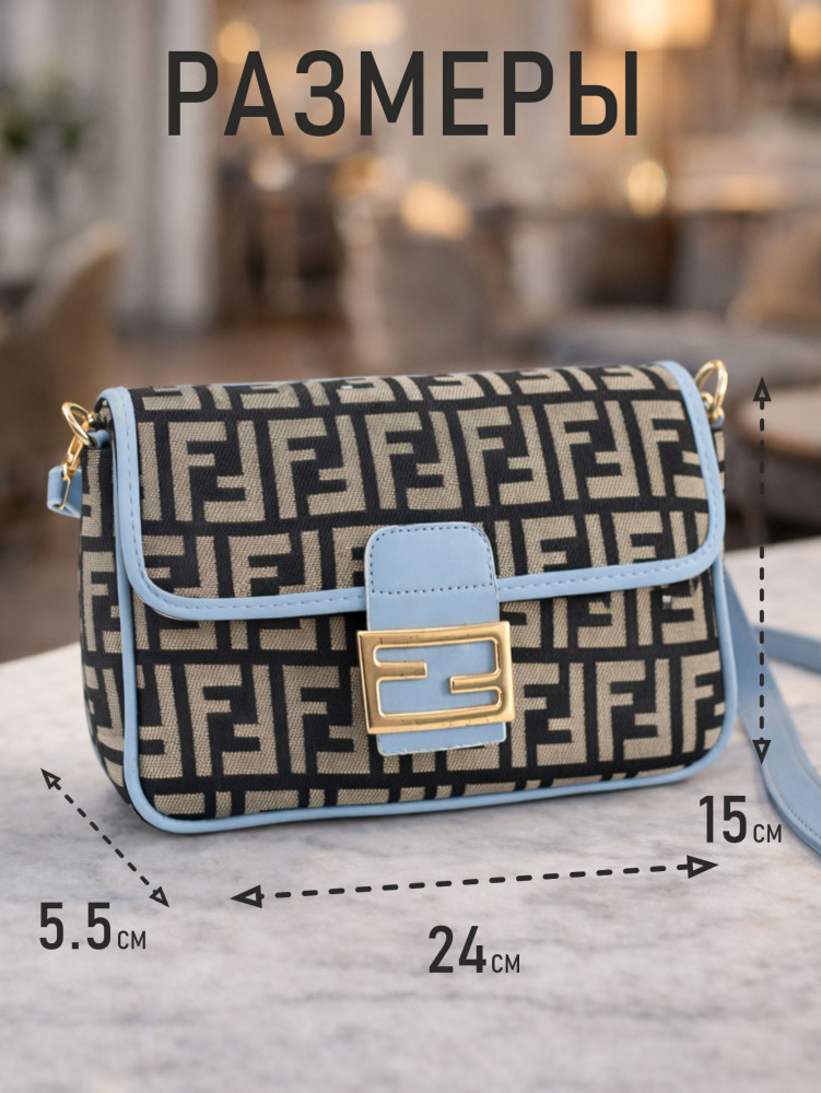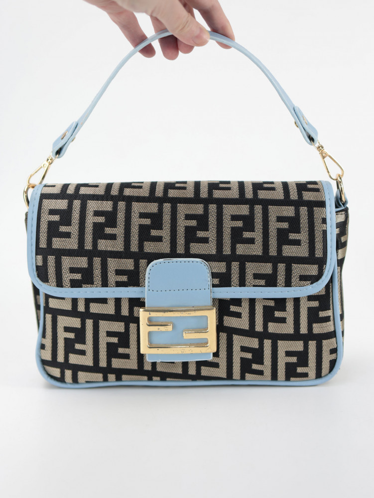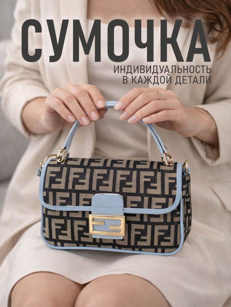 Стильная женская сумочка с модным геометрическим принтом — идеальный аксессуар для повседневных и элегантных образов. Дизайн выполнен в классическом сочетании бежевого и черного цветов с нежной голубой отделкой, которая добавляет сумке оригинальности и делает её ярким акцентом в образе.