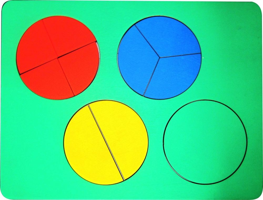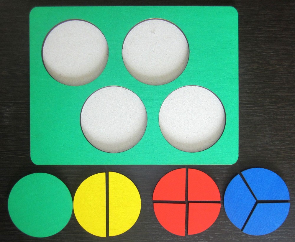 В наборе - 4 круга. Один круг - целый, остальные поделены на части: на две, на три, на четыре.