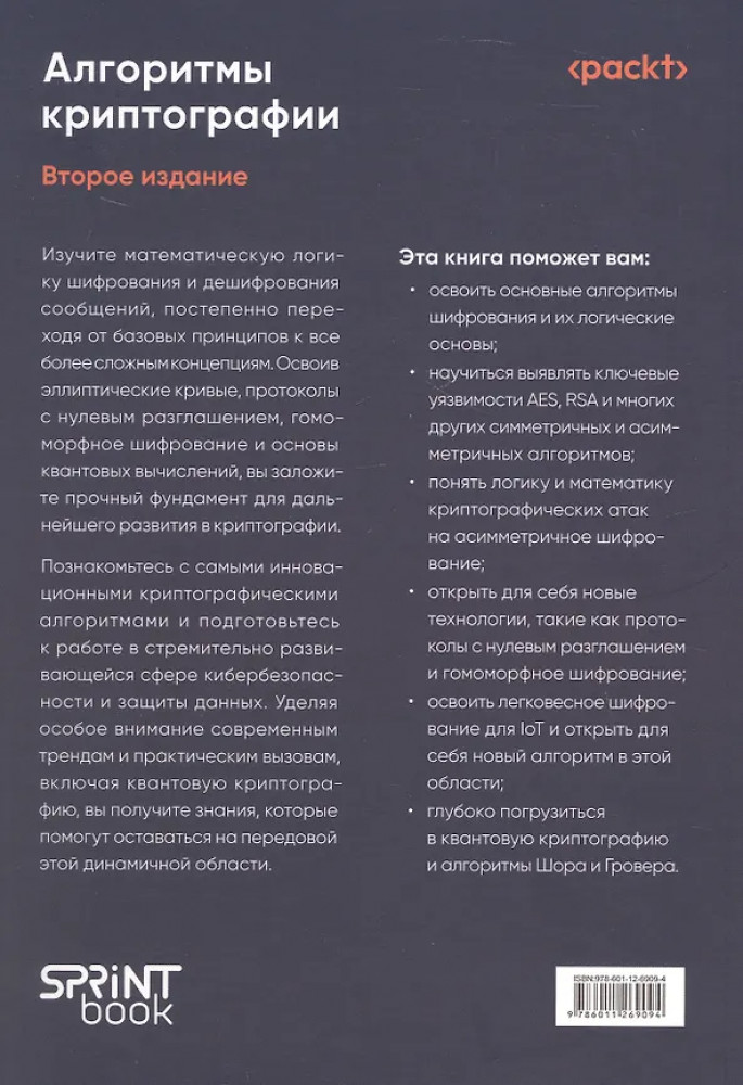 💳 Оплатить за товар можно при получении 🇰🇿 Есть бесплатная доставка по Казахстану от 1 дня 🎁 Копите бонусы с каждой покупки Серия: Библиотека программиста Изучите математическую логику шифрования и дешифрования сообщений, постепенно переходя от базовых принципов ко все более сложным концепциям. Освоив эллиптические кривые, протоколы с нулевым разглашением, гомоморфное шифрование и основы квантовых вычислений, вы заложите прочный фундамент для дальнейшего развития в криптографии. |