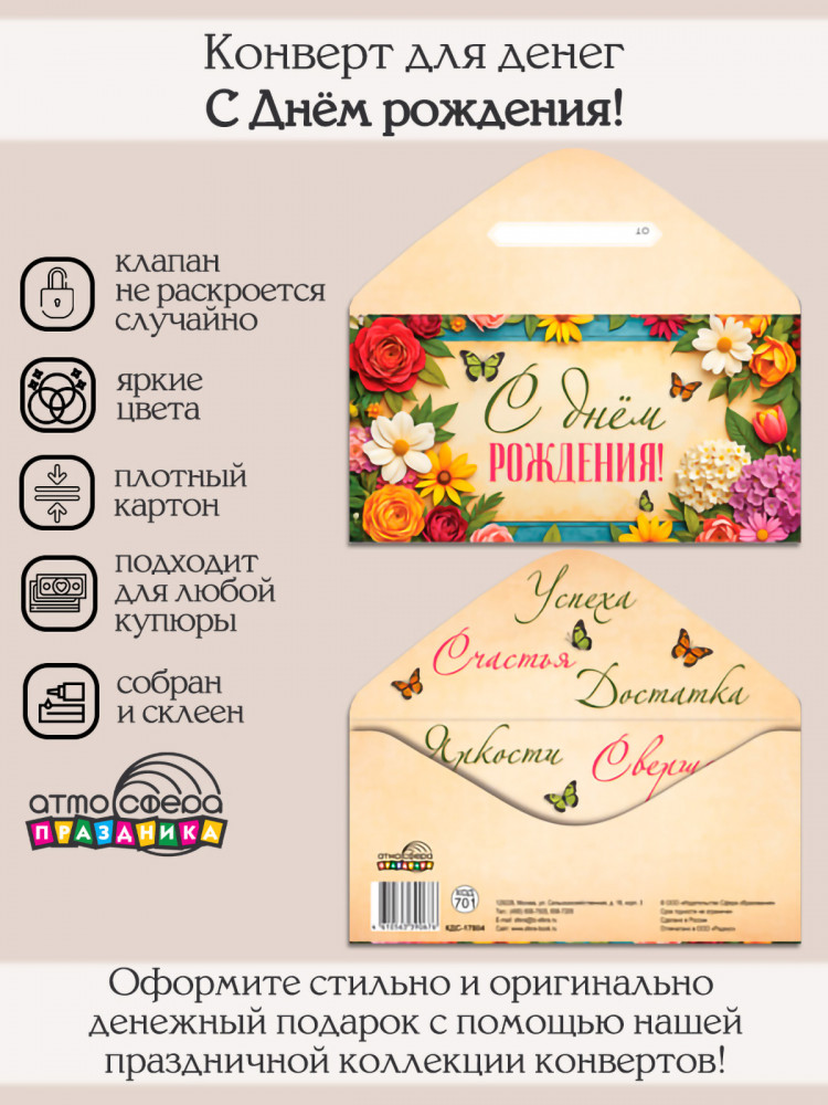 Атмосфера праздника Конверт для денег на склейке. С Днём рождения!+5