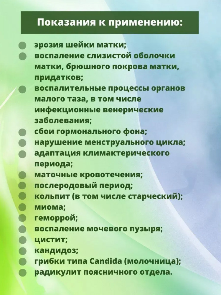 Показания к применению: эрозия шейки матки; воспаление слизистой оболочки матки, брюшного покрова матки, придатков; воспалительные процессы органов малого таза, в том числе инфекционные венерические заболевания; сбои гормонального фона; нарушение менструального цикла; адаптация климактерического периода; маточные кровотечения; послеродовый период; кольпит (в том числе старческий); миома; геморрой; воспаление мочевого пузыря; цистит; кандидоз; грибки типа Candida (молочница); радикулит поясничного отдела; климакс. Профилактика и лечение воспалительных процессов. Восстанавливают микрофлору влагалища. Не применяйте во время менструации.