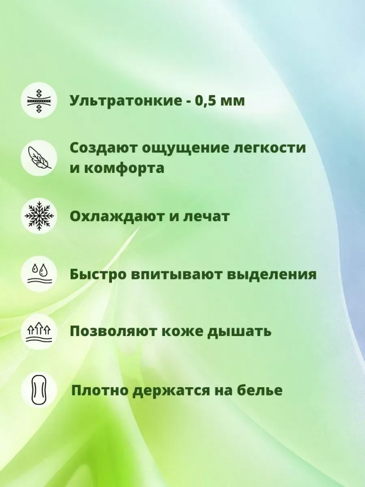 Ультратонкие ежедневки (0,5 мм) дают ощущение сухости, легкости, чистоты и комфорта. 100% хлопковая основа, мягкая дышащая поверхность. Гигиенические прокладки быстро впитывают выделения, супертонкие и удобные. Разработаны с учётом анатомических особенностей женщин. Оказывают антисептическое и антибактериальное действие на слизистую гениталий. Плотно прилегают, позволяют коже дышать и нейтрализуют неприятные запахи. Благодаря качественной клейкой основе изделие прочно закрепляется.