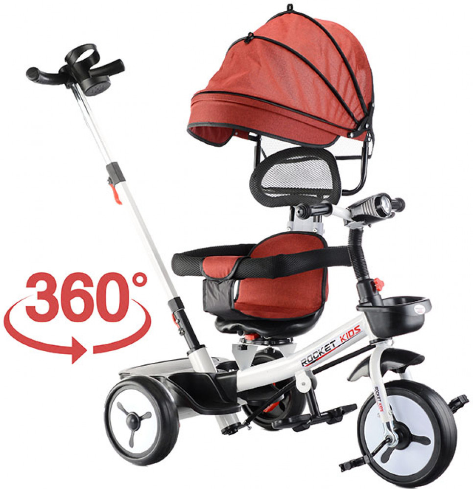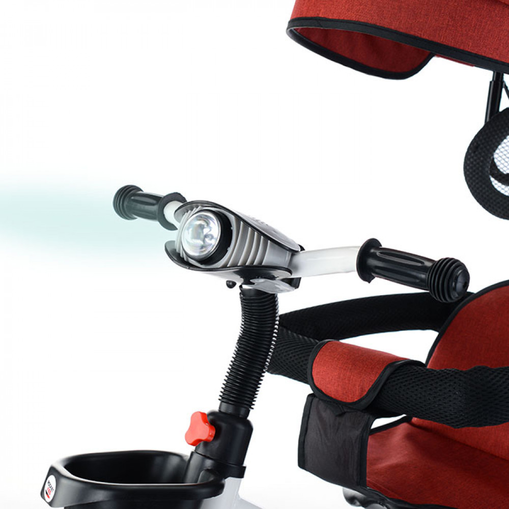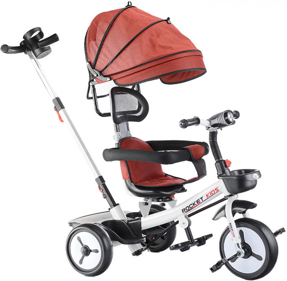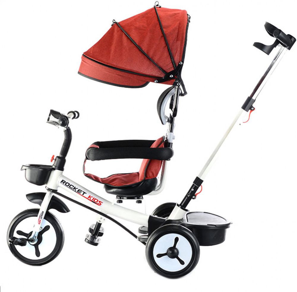 Велосипед трехколесный (одно колесо спереди и два сзади). Размеры велосипеда: 90х50х60 см. Колёса с покрышками из ЭВА. Диаметр переднего колеса: 220 мм. Диаметр задних колёс: 200 мм. Ширина руля: 40 см. Высота от пола до сиденья: 32 см. Складывающиеся подставки для ног. Сиденье можно развернуть спиной к рулю. Высота родительской ручки: 88. 90 см. Управление поворотом переднего колеса при помощи родительской ручки. Раздвижной обод безопасности с мягкими подлокотниками. Спереди и сзади корзины для игрушек. Стояночный тормоз на задних колёсах. На руле установлен разноцветный фонарь, проигрывающий музыкальные мелодии. Свет и звук работают от двух батареек АА (не входят в комплект). Максимальная нагрузка: 25 кг. Солцезащитный козырёк, защитный обод и родительскую ручку можно снять.