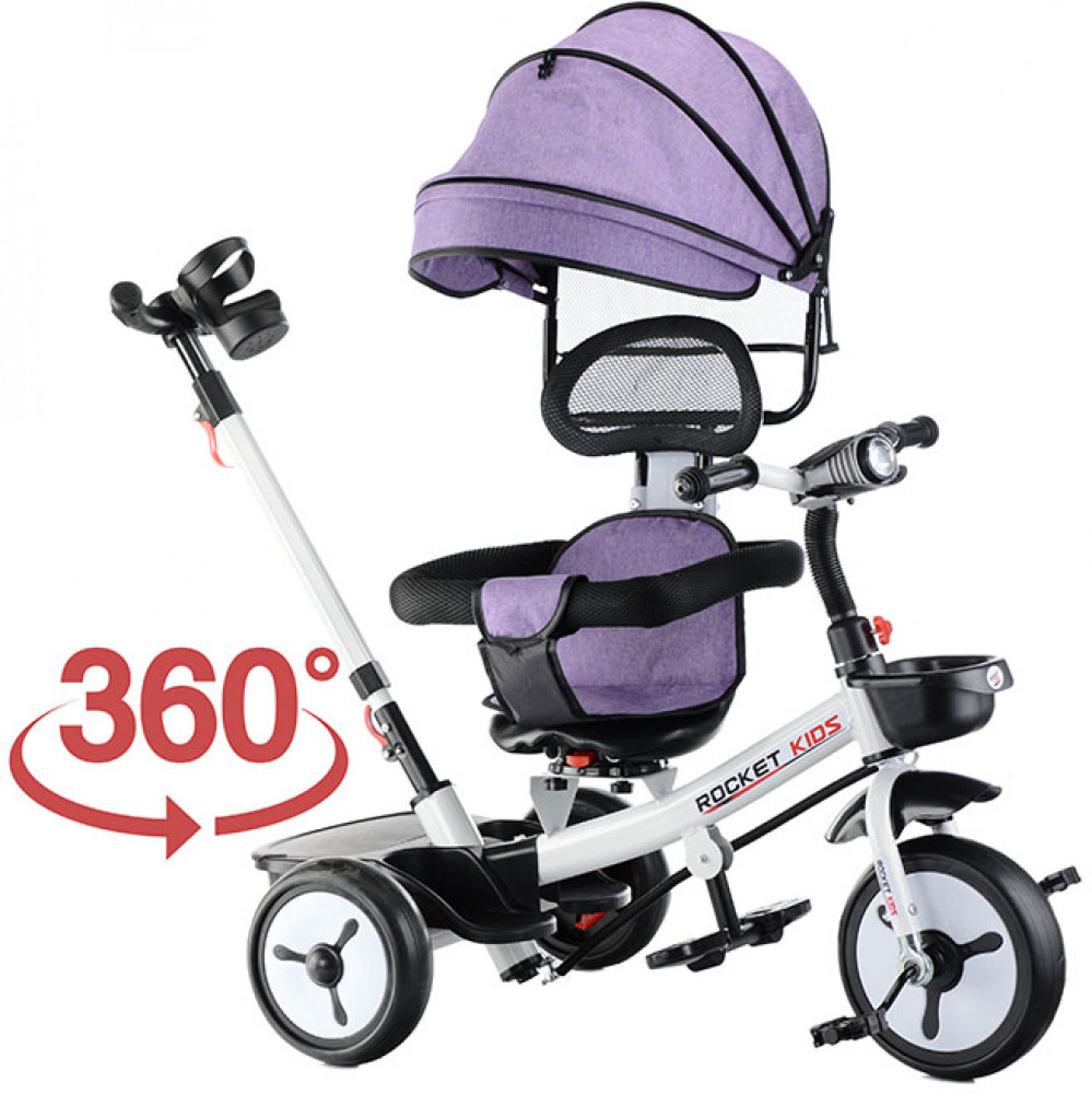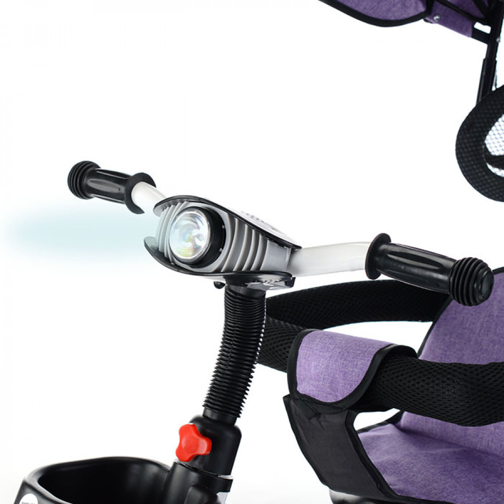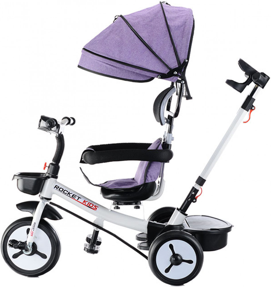 Велосипед трехколесный (одно колесо спереди и два сзади). Размеры велосипеда: 85х50х60 см. Колёса с покрышками из ЭВА. Диаметр переднего колеса: 220 мм. Диаметр задних колёс: 200 мм. Ширина руля: 40 см. Высота от пола до сиденья: 32 см. Складывающиеся подставки для ног. Сиденье можно развернуть спиной к рулю. Высота родительской ручки: 86, 90 см. Управление поворотом переднего колеса при помощи родительской ручки. Раздвижной обод безопасности с мягкими подлокотниками. Спереди и сзади корзины для игрушек. Стояночный тормоз на задних колёсах. На руле установлен разноцветный фонарь, проигрывающий музыкальные мелодии. Свет и звук работают от двух батареек АА (не входят в комплект). Максимальная нагрузка: 25 кг. Солцезащитный козырёк, защитный обод и родительскую ручку можно снять.