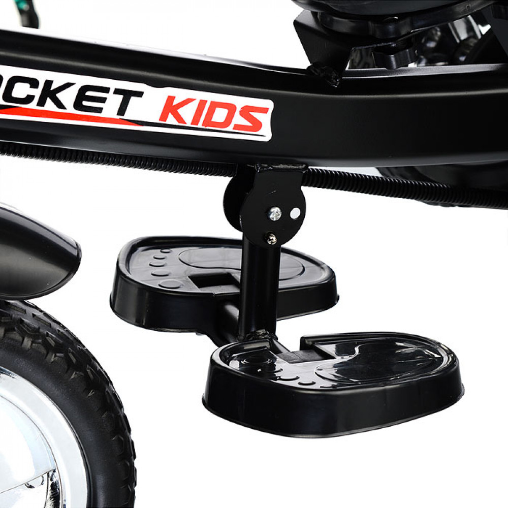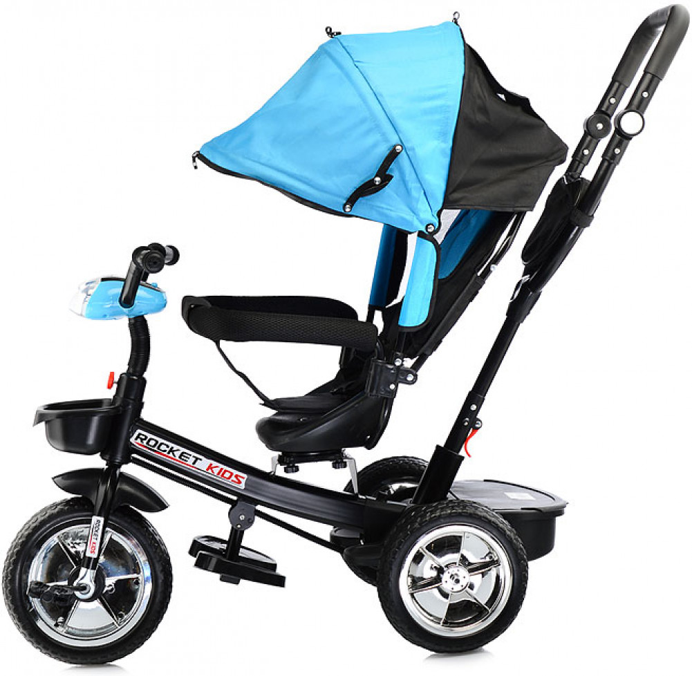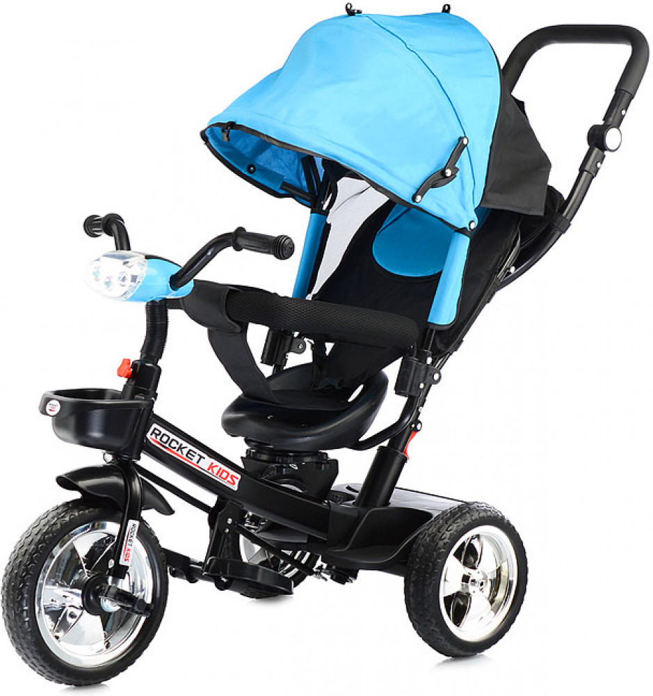 Велосипед трехколесный (одно колесо спереди и два сзади). Габаритные размеры велосипеда: 90х50х95 см. Колёса с шинами из ЭВА. Диаметр переднего колеса: 250 мм. Диаметр задних колёс: 220 мм. Ширина руля: 45 см. Регулируемый наклон спинки (2 положения). Складывающиеся подставки для ног. Солнезащитный козырёк со смотровым окошком. Высота от пола до сиденья: 35 см. Сиденье с ремнём безопасности. Высота родительской ручки: 92 см. Управление поворотом переднего колеса при помощи родительской ручки. Раздвижной обод безопасности с мягкими подлокотниками. Спереди и сзади пластиковые корзины для игрушек. На руле установлен разноцветный фонарь, проигрывающий музыкальные мелодии. Свет и звук работают от двух батареек АА (не входят в комплект). Максимальная нагрузка: 25 кг. Для детей от 1 года до 4 лет. Вес велосипеда: 7.3 кг. Солцезащитный козырёк, защитный обод и родительскую ручку можно снять.