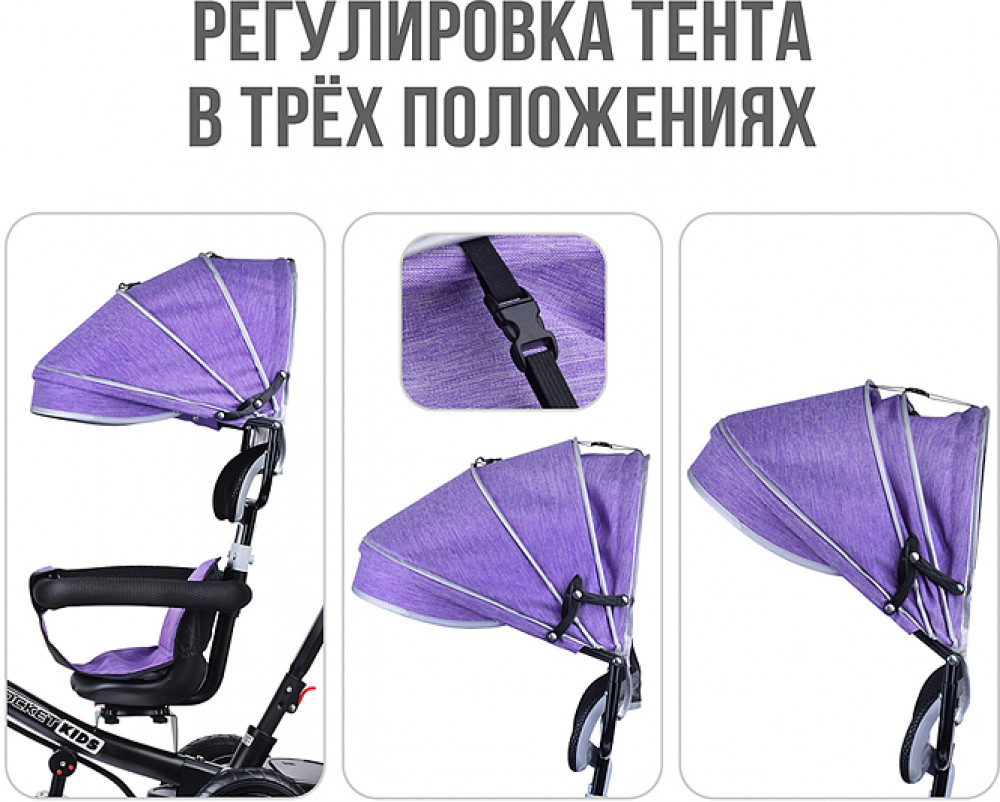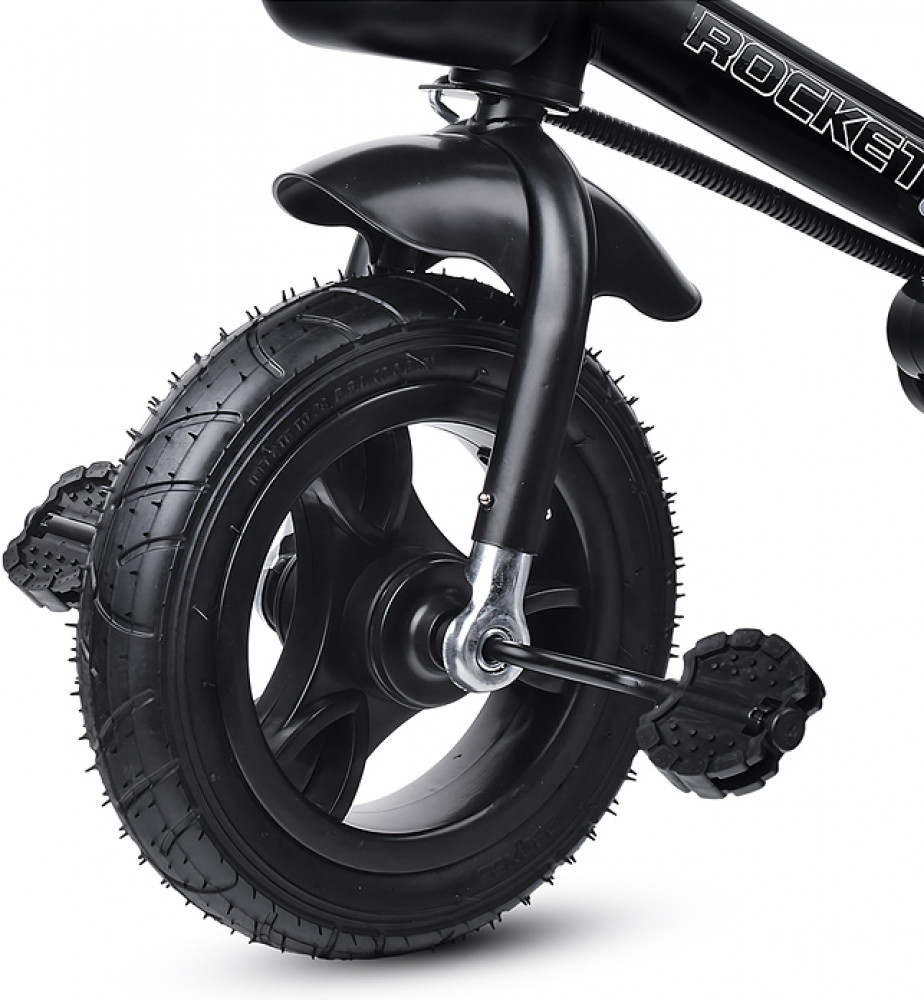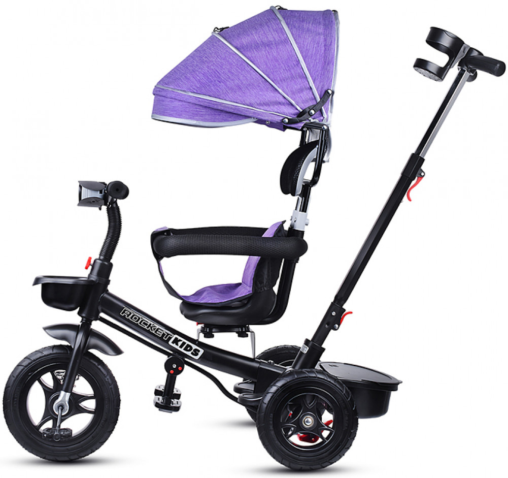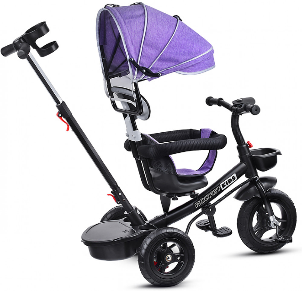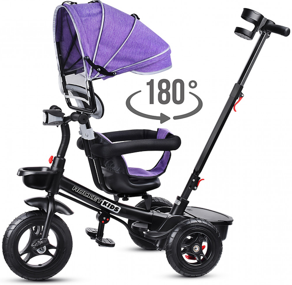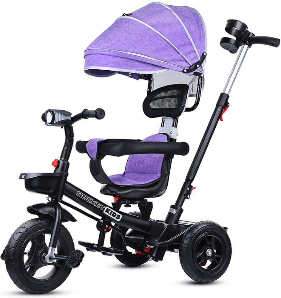 Велосипед трехколесный (одно колесо спереди и два сзади). Размеры велосипеда: 90х50х98 см. Колёса резиновые ненадувные. Диаметр переднего колеса: 250 мм. Диаметр задних колёс: 210 мм. Ширина руля: 40 см. Высота от пола до сиденья: 33 см. Высота от пола до руля: 62. 64 см. Складывающиеся подставки для ног. Сиденье можно развернуть спиной к рулю. Высота родительской ручки: 87, 90 см. Управление поворотом переднего колеса при помощи родительской ручки. Раздвижной обод безопасности с мягкими подлокотниками. На задней колёсной оси устанавливается пластиковая подставка для ног с корзиной для игрушек. На ручке съёмный подстаканник. Стояночный тормоз на задних колёсах. На руле установлен сине-красный фонарь, проигрывающий музыкальные мелодии. Свет и звук работают от двух батареек АА (не входят в комплект). Максимальная нагрузка: 25 кг. Солцезащитный козырёк, защитный обод и родительскую ручку можно снять. Вес велосипеда: 7 кг.