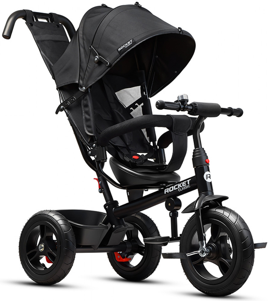 Велосипед трехколесный (одно колесо спереди и два сзади). Размеры велосипеда: 105х50х100 см. Надувные колёса с резиновыми шинами. Диаметр переднего колеса: 12". Диаметр задних колёс: 10". Ширина руля: 42 см. Высота от пола до сиденья: 42 см. Высота от пола до руля: 65 см. Складная подставка для ног. Съёмная родительская ручка с мягкими ручками. Высота родительской ручки: 96, 100 см. Управление поворотом переднего колеса при помощи родительской ручки. Обод безопасности с мягкими подлокотниками (съёмный). 5-точечный ремень безопасности. Регулируемый наклон спинки (3 положения). Складной козырёк. Сетчатое смотровое окно (закрывается на липучку). Пластиковая корзина для игрушек. Стояночный тормоз на задних колёсах. Велосипедный звонок на руле. Максимальная нагрузка: 25 кг. Вес велосипеда: 10 кг. Инструкция по сборке в комплекте.