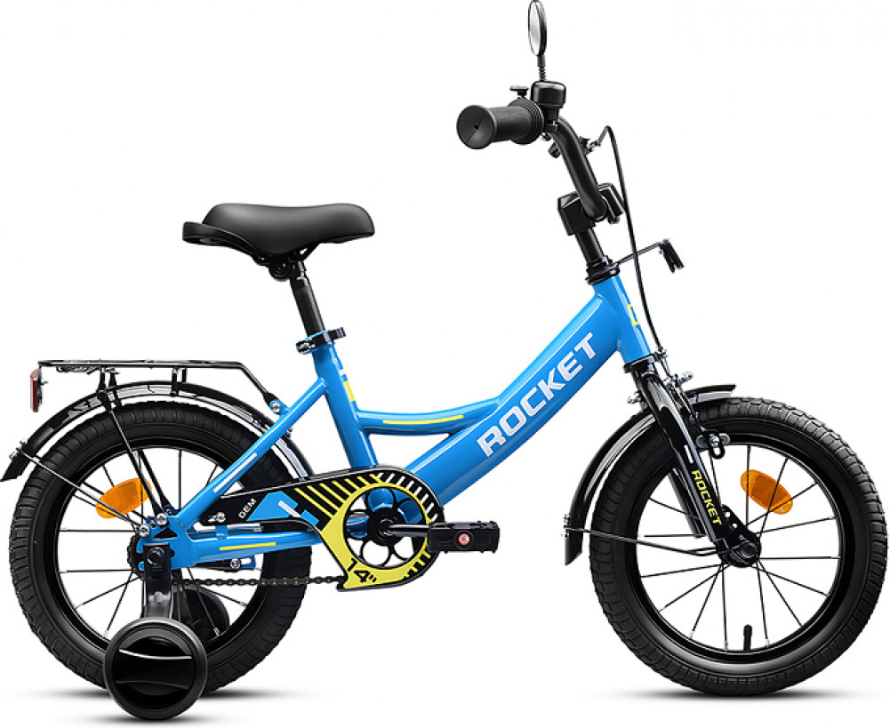 Яркий фирменный стиль ТМ Rocket не оставит равнодушным ни одного ребенка! Отлично держит дорогу за счет резиновых надувных колес, размером 14 дюймов. В комплекте имеются дополнительные учебные колёса. Сиденье из ПВХ, можно регулировать по высоте (53-61 см). Металлические брызговики защитят маленького велосипедиста от загрязнений. Велосипед оснащен передним клещевым и задним ножным тормозами. Ширина руля: 50 см, оснащен противоскользящими прорезиненными ручками. Велосипед подходит для детей 4-6 лет, ростом от 105 до 120 см. Габаритные размеры велосипеда: 112×50×71 см. В комплекте звонок на руль. Металлический багажник. Максимальная нагрузка: 50 кг. Вес велосипеда без упаковки: 9.2 кг. Рама: сталь. Вынос: резьбовой. Вилка: жесткая стальная. Покрышки: 2.125.