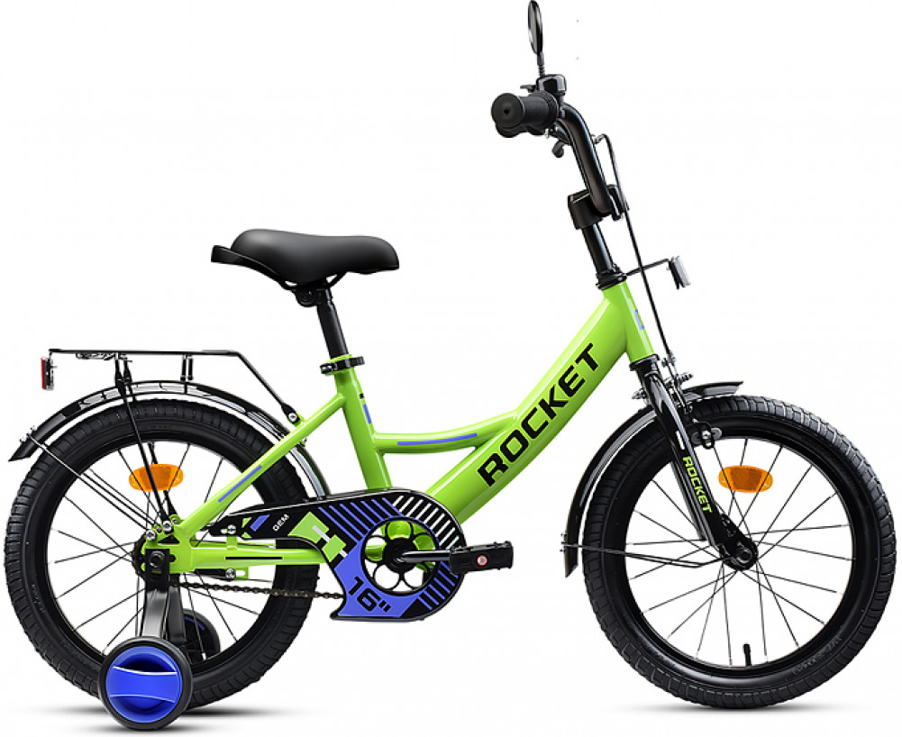 Яркий фирменный стиль ТМ Rocket не оставит равнодушным ни одного ребенка! Отлично держит дорогу за счет резиновых надувных колес, размером 16 дюймов. В комплекте имеются дополнительные учебные колёса. Сиденье из ПВХ, можно регулировать по высоте (55-65 см). Металлические брызговики защитят маленького велосипедиста от загрязнений. Велосипед оснащен передним клещевым и задним ножным тормозами. Ширина руля: 50 см, оснащен противоскользящими прорезиненными ручками. Велосипед подходит для детей 5-7 лет, ростом от 110 до 125 см. Габаритные размеры велосипеда: 115×50×74 см. В комплекте звонок на руль. Металлический багажник. Максимальная нагрузка: 50 кг. Вес велосипеда без упаковки: 8 кг. Рама: сталь. Вынос: резьбовой. Вилка: жесткая стальная. Покрышки: 2.125.