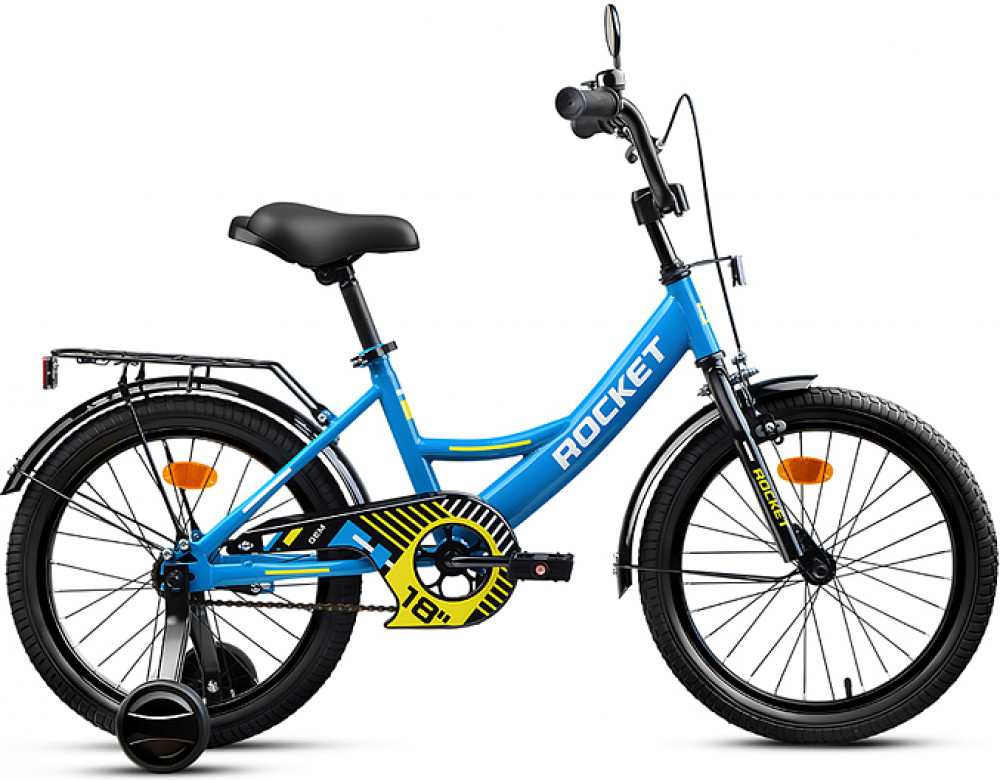 Яркий фирменный стиль ТМ Rocket не оставит равнодушным ни одного ребенка! Отлично держит дорогу за счет резиновых надувных колес, размером 18 дюймов. В комплекте имеются дополнительные учебные колёса. Сиденье из ПВХ, можно регулировать по высоте (59-68 см). Металлические брызговики защитят маленького велосипедиста от загрязнений. Велосипед оснащен передним клещевым и задним ножным тормозами. Ширина руля: 50 см, оснащен противоскользящими прорезиненными ручками. Велосипед подходит для детей 6-8 лет, ростом от 115 до 130 см. Габаритные размеры велосипеда: 125×54×83 см. В комплекте звонок на руль. Металлический багажник. Максимальная нагрузка: 50 кг. Вес велосипеда без упаковки: 10 кг. Рама: сталь. Вынос: резьбовой. Вилка: жесткая стальная. Покрышки: 2.125.