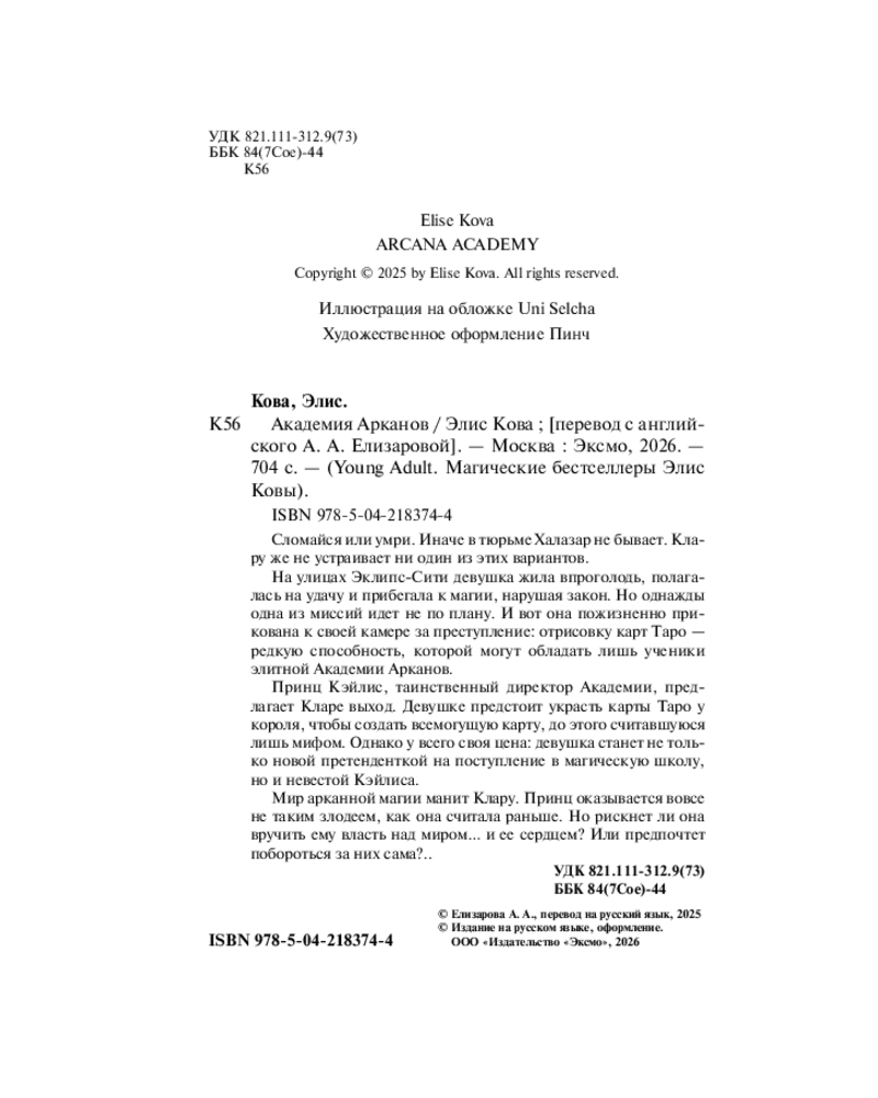 💳 Оплатить за товар можно при получении 🇰🇿 Есть бесплатная доставка по Казахстану от 1 дня 🎁 Копите бонусы с каждой покупки Серия: Young Adult. Магические бестселлеры Элис Ковы Добро пожаловать в магическую «Академию Арканов»! В этом цикле культовой писательницы фэнтези Элис Ковы вас ждет погружение в темную школу магии карт, фиктивный роман, тропы «от врагов к возлюбленным», «прикоснешься к ней — умрешь» и тайные преступления. |
