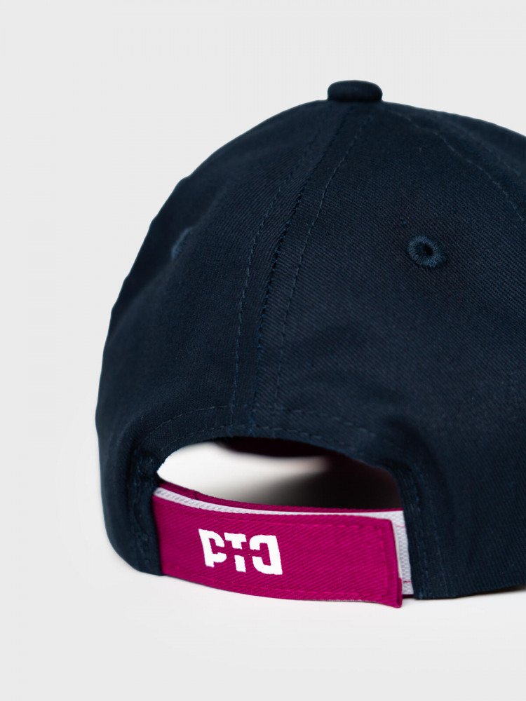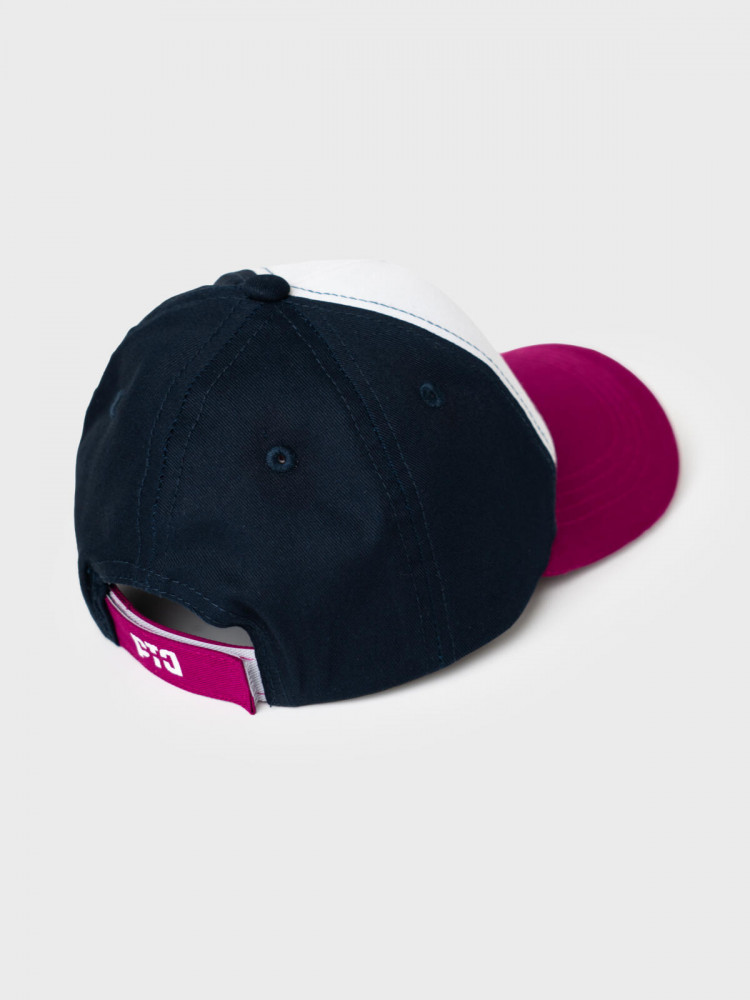 Детская бейсболка для мальчика. Козырёк — изогнутый с белой окантовкой и чёрной декоративной строчкой. Застёжка на липучке позволяет регулировать размер. Бейсболка дополнена вентиляционными отверстиями.