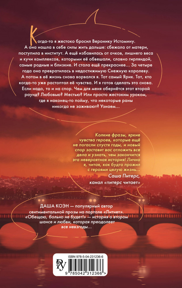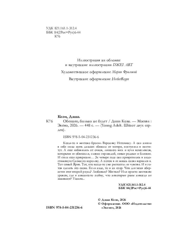 💳 Оплатить за товар можно при получении 🇰🇿 Есть бесплатная доставка по Казахстану от 1 дня 🎁 Копите бонусы с каждой покупки Серия: Young Adult. Шёпот двух сердец Новинка от Даши Коэн — популярного автора молодежной сентиментальной прозы. Продолжение истории Ярослава Басова и Вероники Истоминой. Внутри книги вас ждут тропы «второй шанс» и «от ненависти до любви». История придется по вкусу поклонникам Эмилии Грин и Ники Сью. В подарок читателям открытка! |