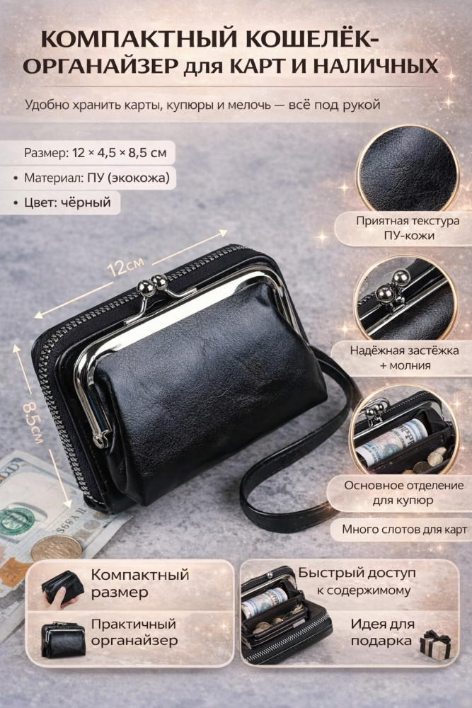 Стильный и удобный кошелёк, который сочетает в себе компактность и вместительность. Идеально подходит для хранения карт, купюр и мелочи — всё под рукой и в порядке.