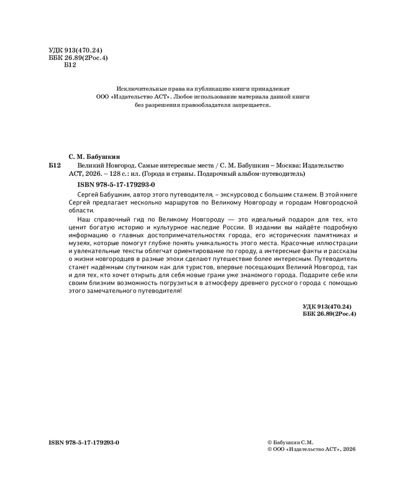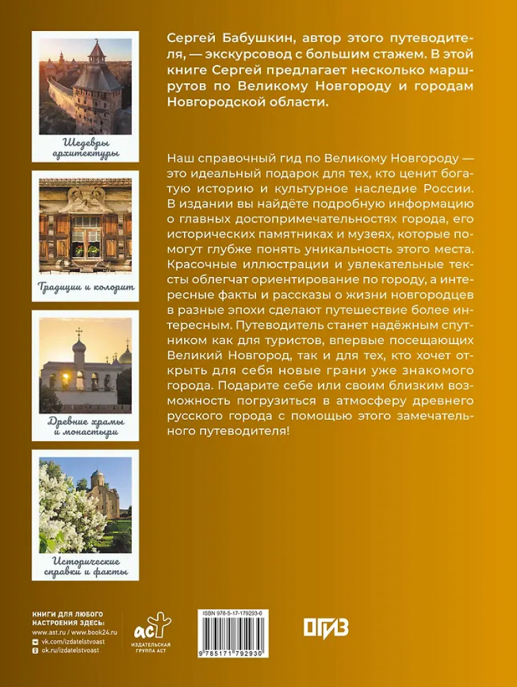 💳 Оплатить за товар можно при получении 🇰🇿 Есть бесплатная доставка по Казахстану от 1 дня 🎁 Копите бонусы с каждой покупки Серия: Города и страны. Подарочный альбом-путеводитель Сергей Бабушкин, автор этого путеводителя, — экскурсовод с большим стажем. В этой книге Сергей предлагает несколько маршрутов по Великому Новгороду и городам Новгородской области. Наш справочный гид по Великому Новгороду — это идеальный подарок для тех, кто ценит богатую историю и культурное наследие России. В издании вы найдёте подробную информацию о главных достопримечательностях города, его исторических памятниках и музеях, которые помогут глубже понять уникальность этого места. Красочные иллюстрации и увлекательные тексты облегчат ориентирование по городу, а интересные факты и рассказы о жизни новгородцев в разные эпохи сделают путешествие более интересным. Путеводитель станет надёжным спутником как для туристов, впервые посещающих Великий Новгород, так и для тех, кто хочет открыть для себя новые грани уже знакомого города. Подарите себе или своим близким возможность погрузиться в атмосферу древнего русского города с помощью этого замечательного путеводителя! |