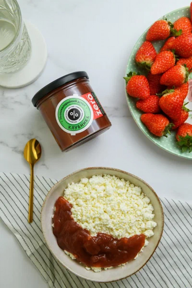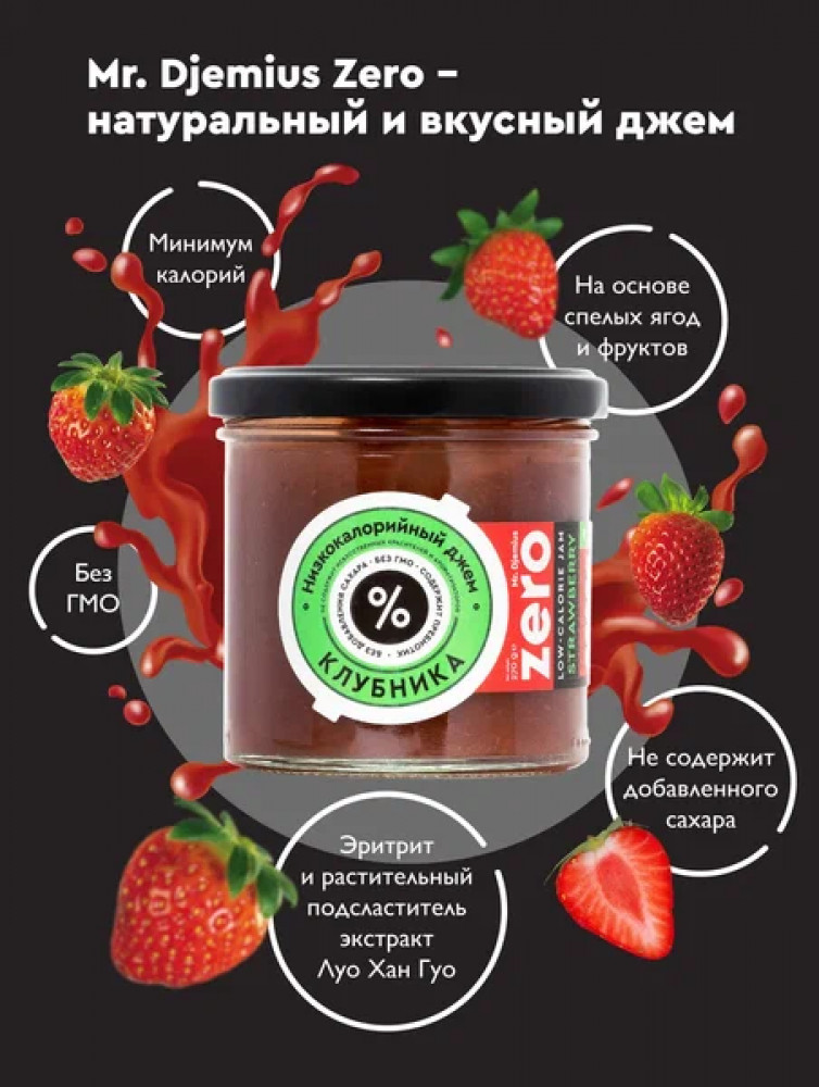 Низкоуглеводный клубничный джем без сахара от Mr. Djemius ZERO по вкусу не отличить от обычного клубничного варенья, его текстура густая и нежная с кусочками протертой ягоды.