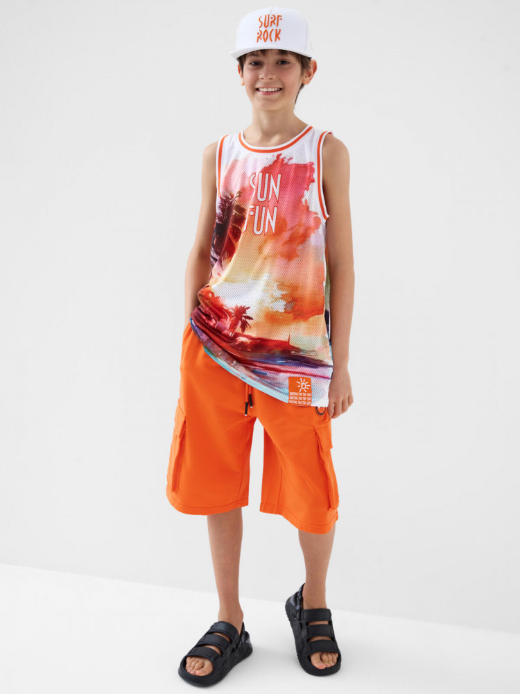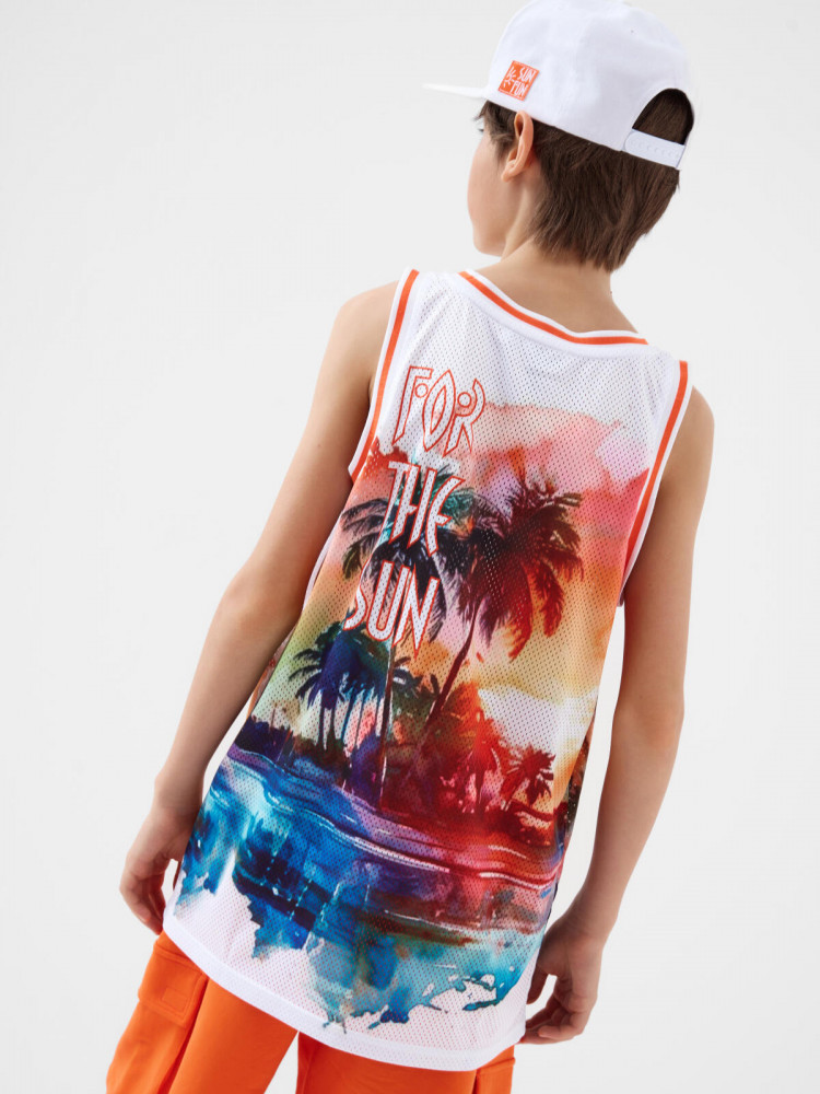Майка для мальчика подростка. Модель прямого силуэта, без рукавов, с круглой горловиной. Выполнена из сетки. Спереди — крупный принт. Внизу — маленькая нашивка.