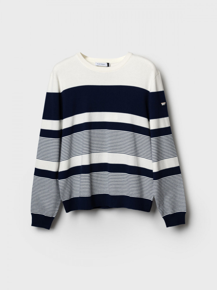 Мужской джемпер. Модель с длинными рукавами и классическим круглым вырезом. Выполнен из вязаного трикотажа и украшен стильным принтом в полоску. Горловина, манжеты и низ изделия обработаны эластичным рибом, что обеспечивает комфортную посадку. На левом рукаве - небольшая фирменная нашивка.