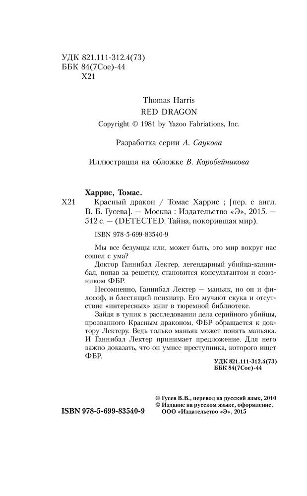 Красный драконВ данный момент этот товар отсутствует в продаже. Возможно, у нас найдется аналогичный или похожий товар здесь. Серия: DETECTED. Тайна, покорившая мир Мы все безумцы или, может быть, это мир вокруг нас сошел с ума? Доктор Ганнибал Лектер, легендарный |