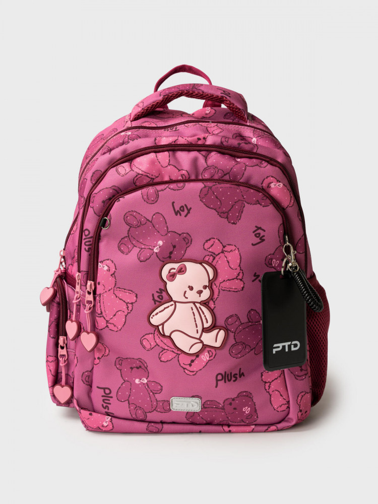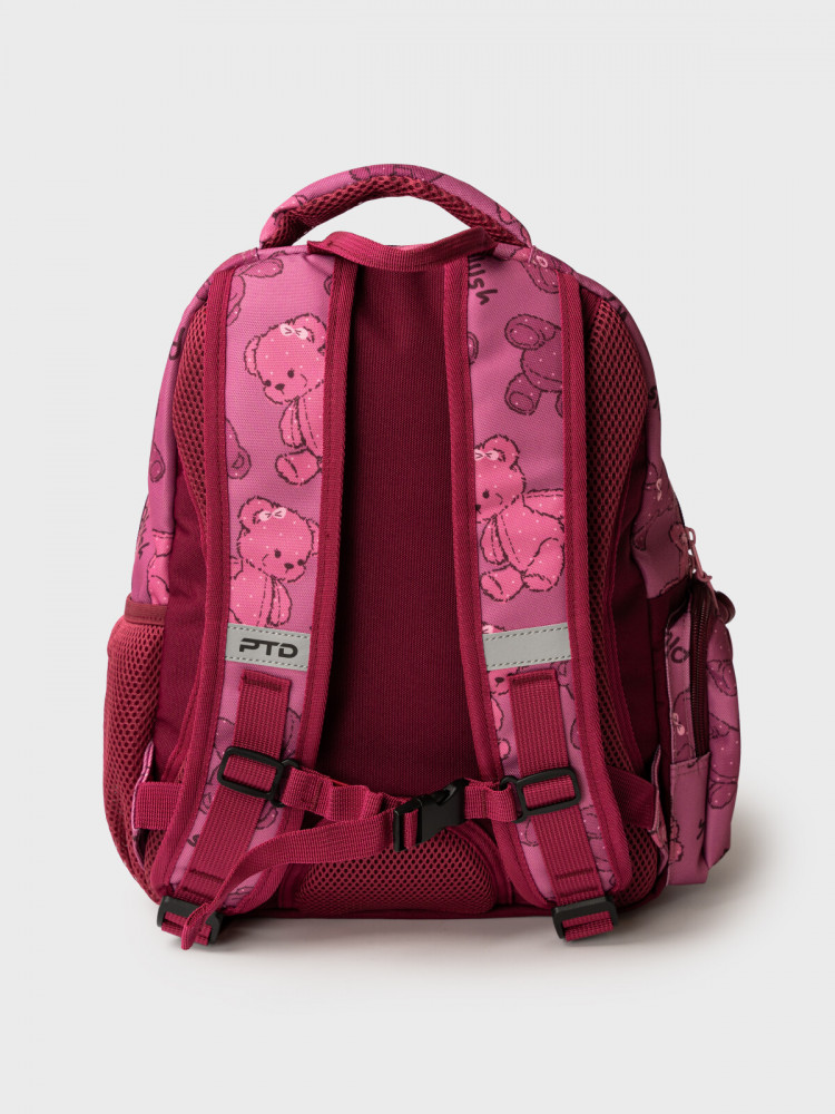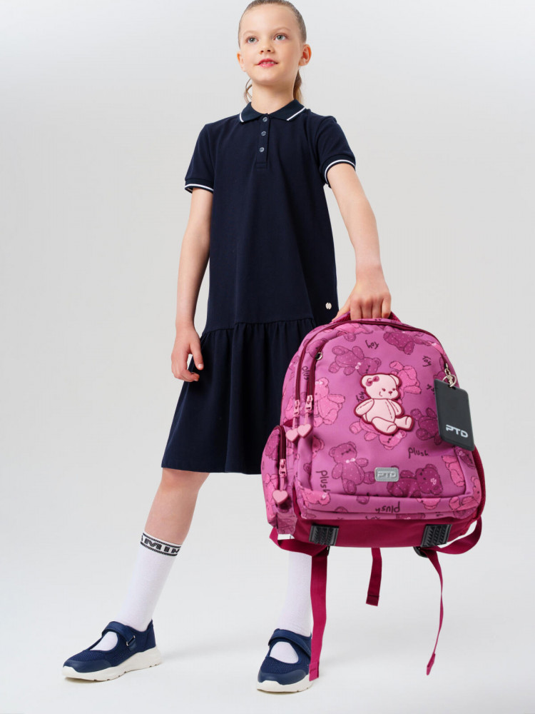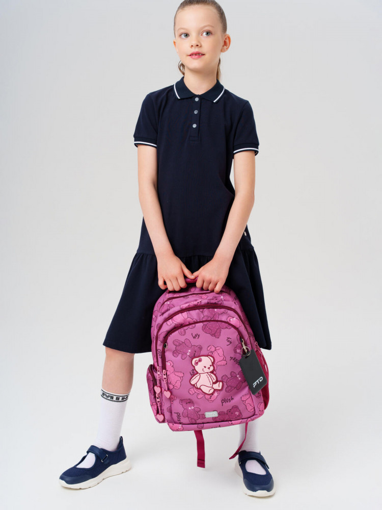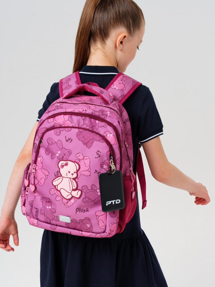 Трехсекционный рюкзак с ортопедической спинкой для девочки школьницы. Конструкция ортопедической вентилируемой спинки обеспечивает максимальный комфорт и позволяет снизить нагрузку на спину школьников и дошкольников. Широкие мягкие вентилируемые лямки регулируются по высоте, что делает рюкзак идеальным как для первоклассника, так и для детей из средней школы. Спереди лямки можно закрепить на застежку, чтобы они не спадали. Дно имеет уплотнительный вкладыш, который при необходимости можно не использовать. Снизу дна имеются резиновые «ножки», чтобы низ рюкзака не пачкался. Рюкзак имеет два основных отделения на молнии один большой карман спереди. Внутри имеется несколько отделений и кармашков для систематизации школьных принадлежностей. По бокам есть карманы: один — сетчатый, второй — на молнии. У рюкзака есть две ручки: одна — мягкая вентилируемая ручка для ношения в руках, вторая маленькая — для того, чтобы рюкзак можно было вешать на вешалку. Модель выполнена из водонепроницаемой ткани. Ранец имеет светоотражающие детали на лямках, по бокам, на переднем отделении, чтобы ребенка было хорошо видно в темноте со всех сторон. В подарок идет пластиковый чехол для пропуска на растягивающейся пружине. Пружина дает возможность спокойно приложить пропуск к турникету не снимая рюкзак. Ранец декорирован милым патчем Мишкой. Рюкзак в школу можно дополнить мешком для обуви и пеналом в том же дизайне.