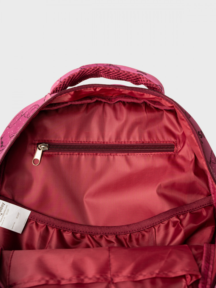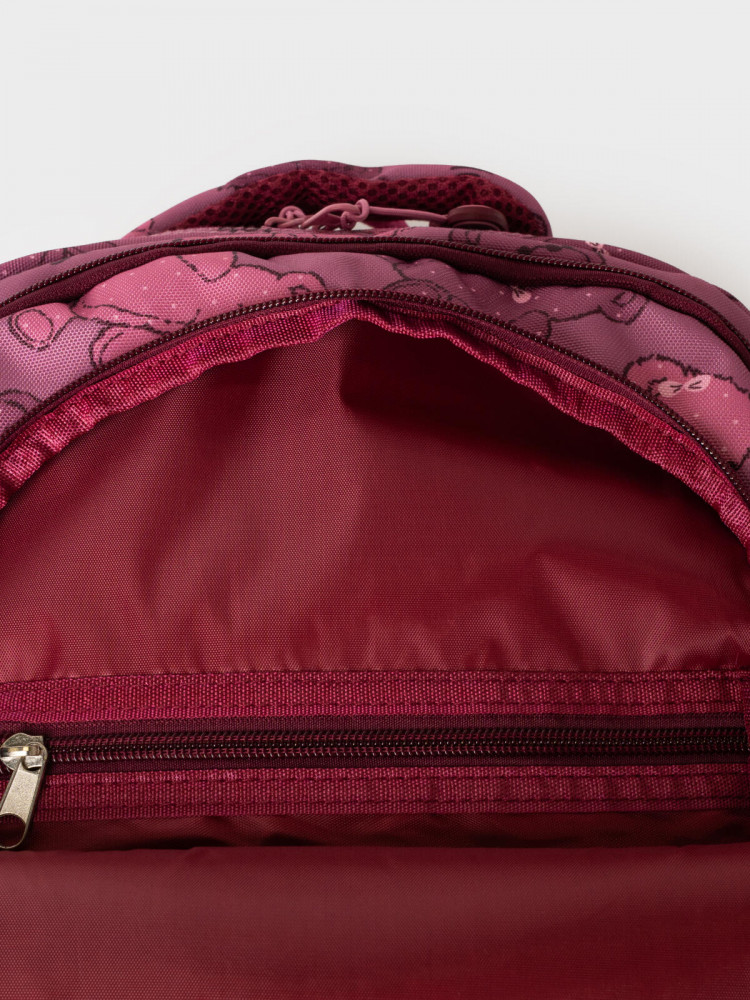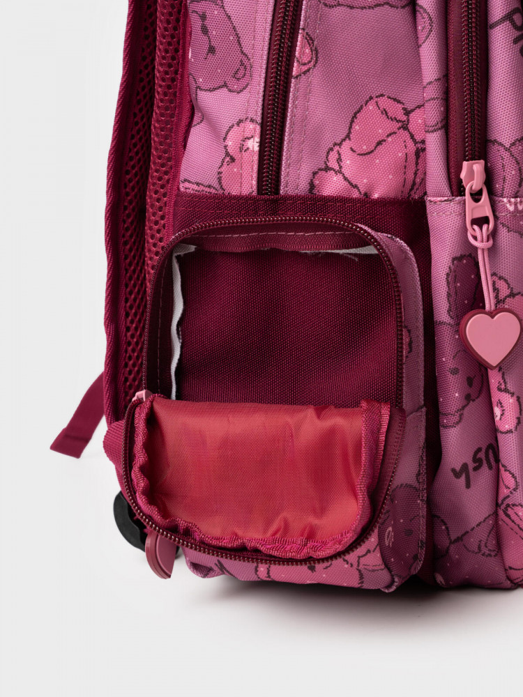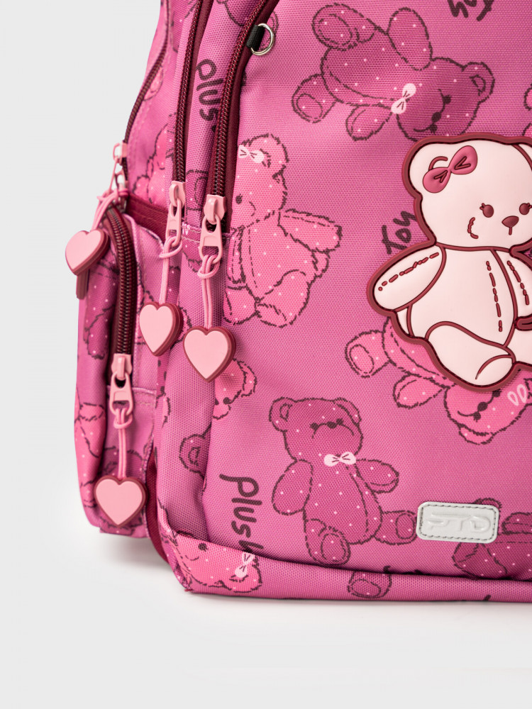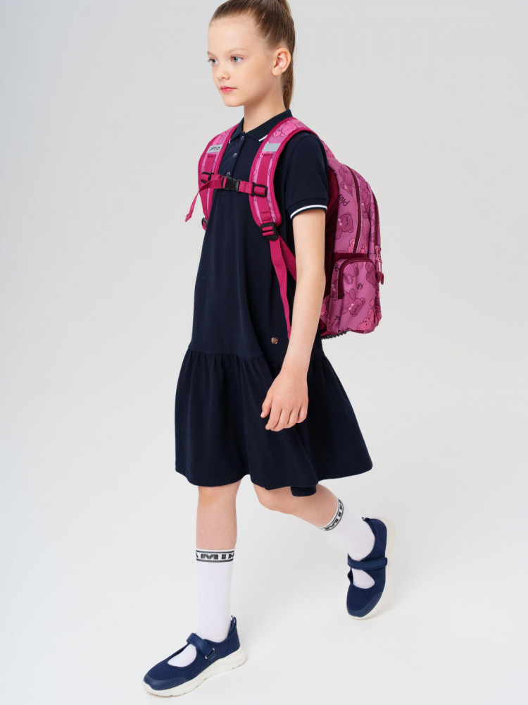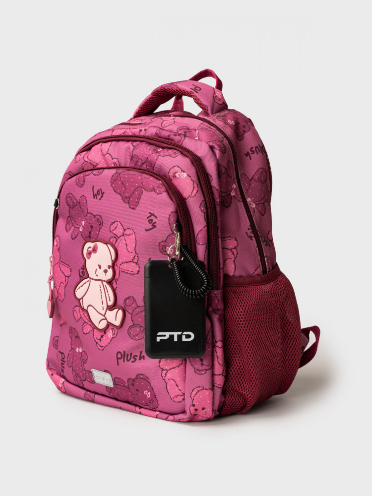 Трехсекционный рюкзак с ортопедической спинкой для девочки школьницы. Конструкция ортопедической вентилируемой спинки обеспечивает максимальный комфорт и позволяет снизить нагрузку на спину школьников и дошкольников. Широкие мягкие вентилируемые лямки регулируются по высоте, что делает рюкзак идеальным как для первоклассника, так и для детей из средней школы. Спереди лямки можно закрепить на застежку, чтобы они не спадали. Дно имеет уплотнительный вкладыш, который при необходимости можно не использовать. Снизу дна имеются резиновые «ножки», чтобы низ рюкзака не пачкался. Рюкзак имеет два основных отделения на молнии один большой карман спереди. Внутри имеется несколько отделений и кармашков для систематизации школьных принадлежностей. По бокам есть карманы: один — сетчатый, второй — на молнии. У рюкзака есть две ручки: одна — мягкая вентилируемая ручка для ношения в руках, вторая маленькая — для того, чтобы рюкзак можно было вешать на вешалку. Модель выполнена из водонепроницаемой ткани. Ранец имеет светоотражающие детали на лямках, по бокам, на переднем отделении, чтобы ребенка было хорошо видно в темноте со всех сторон. В подарок идет пластиковый чехол для пропуска на растягивающейся пружине. Пружина дает возможность спокойно приложить пропуск к турникету не снимая рюкзак. Ранец декорирован милым патчем Мишкой. Рюкзак в школу можно дополнить мешком для обуви и пеналом в том же дизайне.