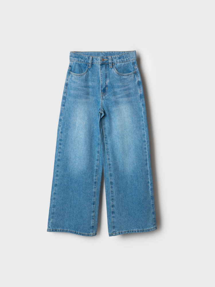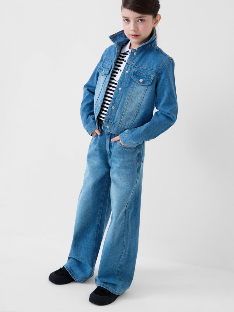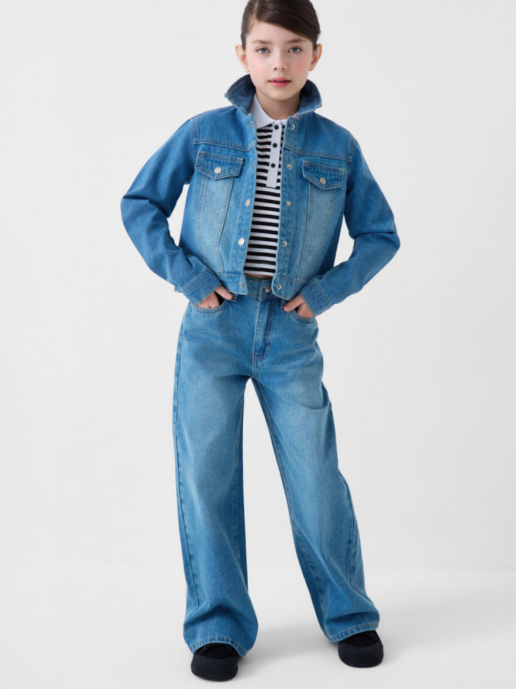 Джинсы прямые для девочки подростка. Модель свободного кроя с широкой штаниной и классической посадкой на талии. По переду расположены два стандартных кармана и маленький дополнительный карман, сзади — два накладных. В поясе предусмотрена регулировка объема за счёт резинки с пуговицами. Джинсы застёгиваются на молнию и болт.