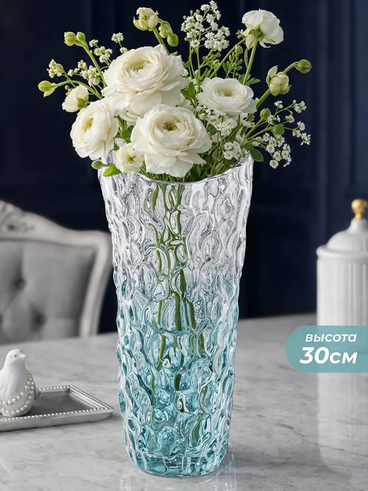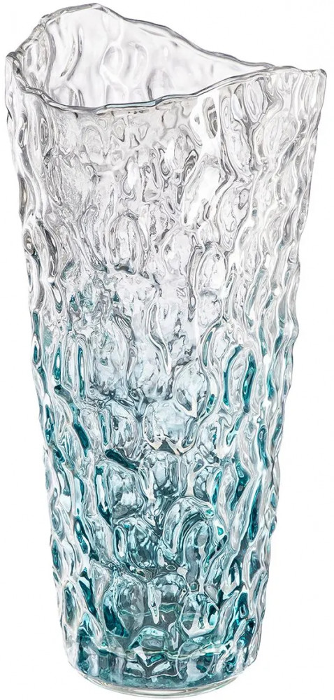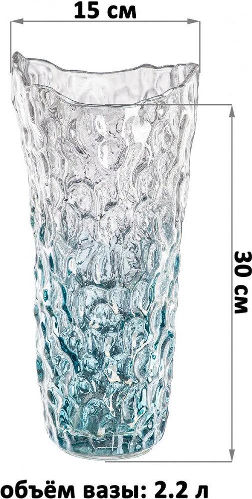 Ваза от Elan Gallery объёмом 2.2 литра выполнена из стекла. Размер 15×15×30 см. Диаметр дна 9 см. Прозрачная ваза украшена рельефным узором, имеет край в виде декоративной неровности. Подойдёт для живых и искусственных цветов, веток и сухоцветов. У основания окрашена градиентом, то есть имеет плавный переход от голубого оттенка к прозрачному. Стильная вазочка с рельефным узором послужит элементом декора для вашего дома. В ней красиво будут смотреться букеты из любых цветов или веточек: роз, тюльпанов, вербы. Интерьерная ваза украсит комнату даже без наполнения.