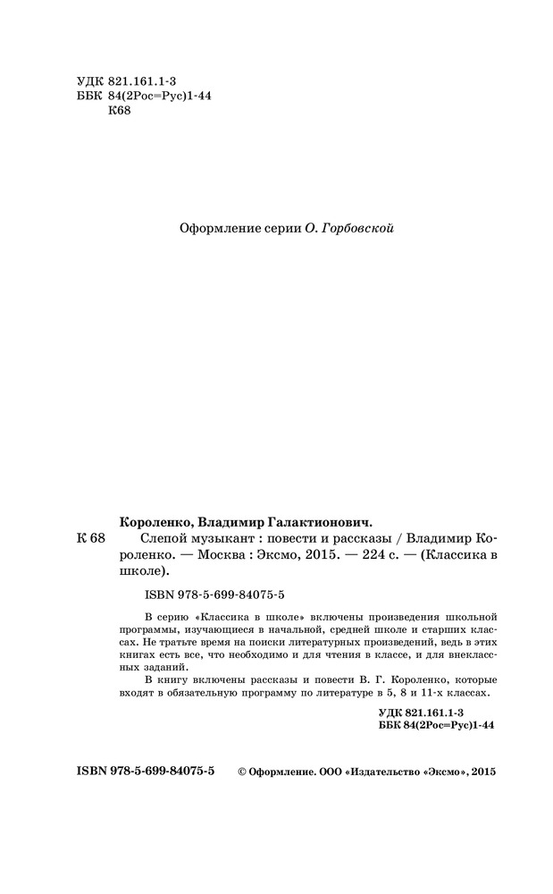 Слепой музыкантВладимир Галактионович Короленко В данный момент этот товар отсутствует в продаже. Возможно, у нас найдется аналогичный или похожий товар здесь. Серия: Классика в школе В серию «Классика в школе» включены произведения школьной программы, изучающиеся в начальной, средней школе и старших классах. Не тратьте время на поиски литературных произведений, ведь в этих книгах есть все, что необходимо и для чтения в классе, и для внеклассных заданий. |