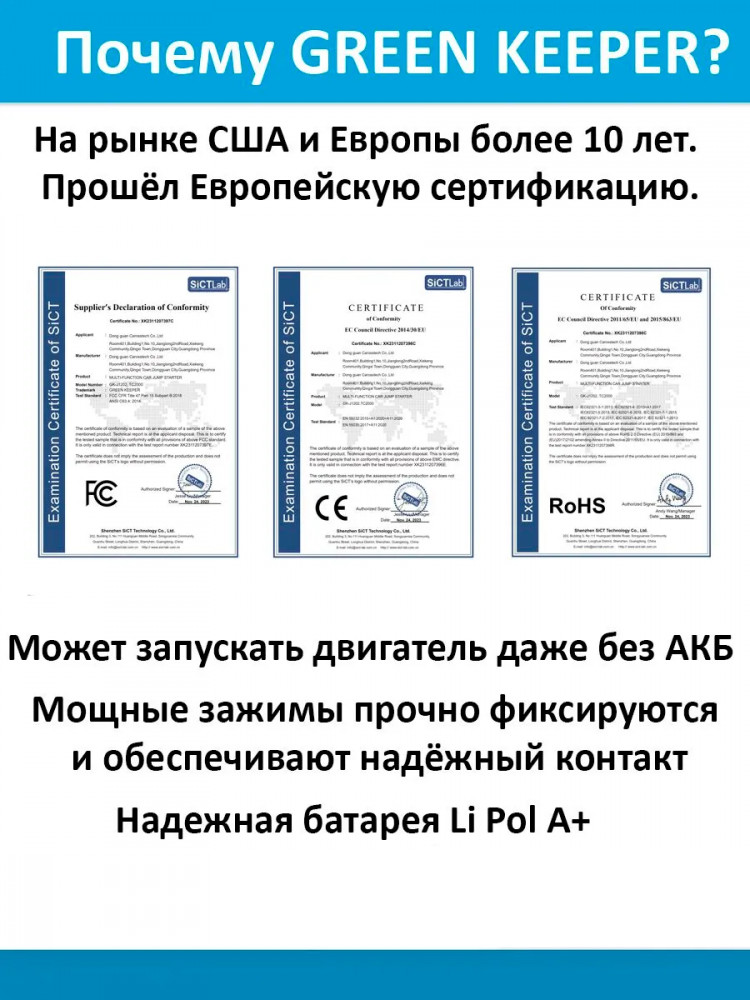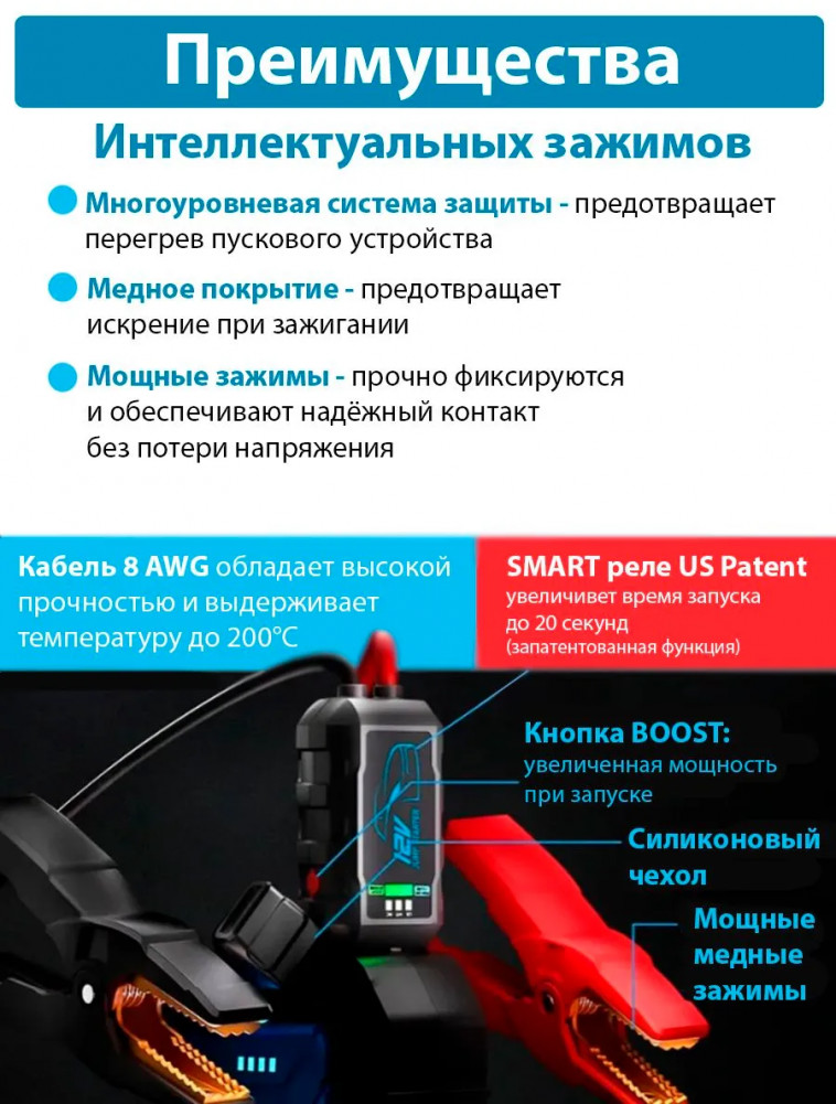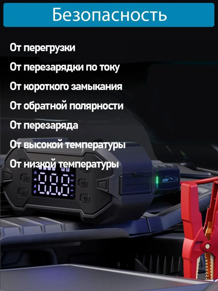 Обеспечение безопасности при запуске двигателя реализовано через интеллектуальную систему защиты с 10 уровнями, включая защиту от перегрузки по току, перезаряда, переразряда, короткого замыкания, искробезопасность и защиту от обратной полярности.