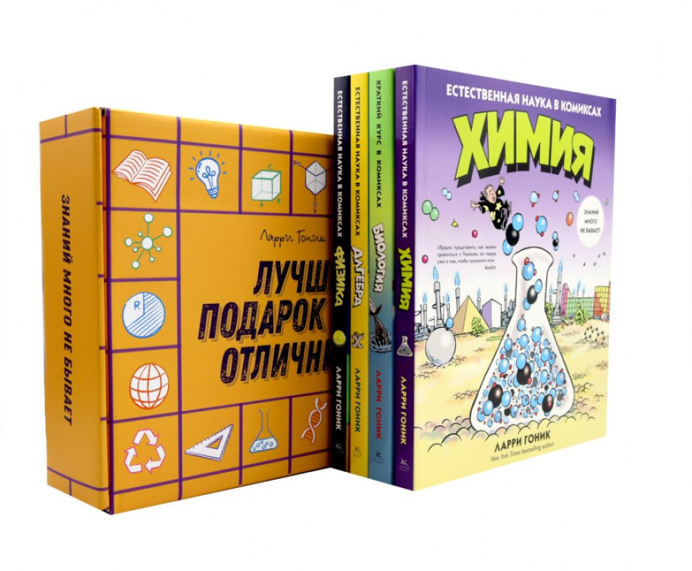 Подарочный набор книг для школьников, который превратит изучение сложных наук в увлекательное приключение! Этот яркий книжный бокс объединил лучшие научно-популярные комиксы от Ларри Гоника. Четыре книги охватывают все основные школьные предметы — алгебру, физику, биологию и химию, предлагая уникальный формат подачи материала через веселые иллюстрации и доступные объяснения. Это настоящая большая энциклопедия школьника в современном формате, где нескучная наука оживает на каждой странице!