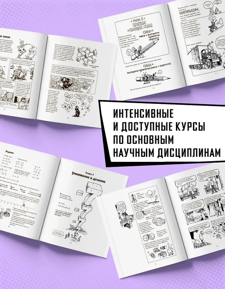 В книжный бокс входит интенсивный курс алгебры, который превратит основы математики в захватывающее путешествие, где с помощью живых примеров и юмора автор делает понятную математику доступной; увлекательная физика в комиксах, которая познакомит с великими учеными от Аристотеля до Эйнштейна, раскрывая занимательные факты о механике, электричестве и даже квантовой теории; биология в комиксах, где сложные темы становятся интересными фактами благодаря остроумным иллюстрациям; и химия для детей, которая доказывает, что это нескучная наука с практическим применением в жизни. Этот подарочный набор книг про науку — то, что надо, если вы ищете подарок мальчику на Новый год или подарок на Новый год девочке. Научно-популярная литература как новогодний подарок ребенку поможет в обучении, став отличным дополнением к школьной программе.